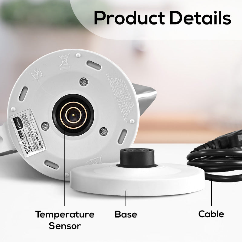 When the Kettle Jug sits on the Base and the ON/OFF Switch located on the Handle is turned on, the highly efficient, concealed heating elements in the Base supplies heat to the Kettle Jug and boils the water quickly.