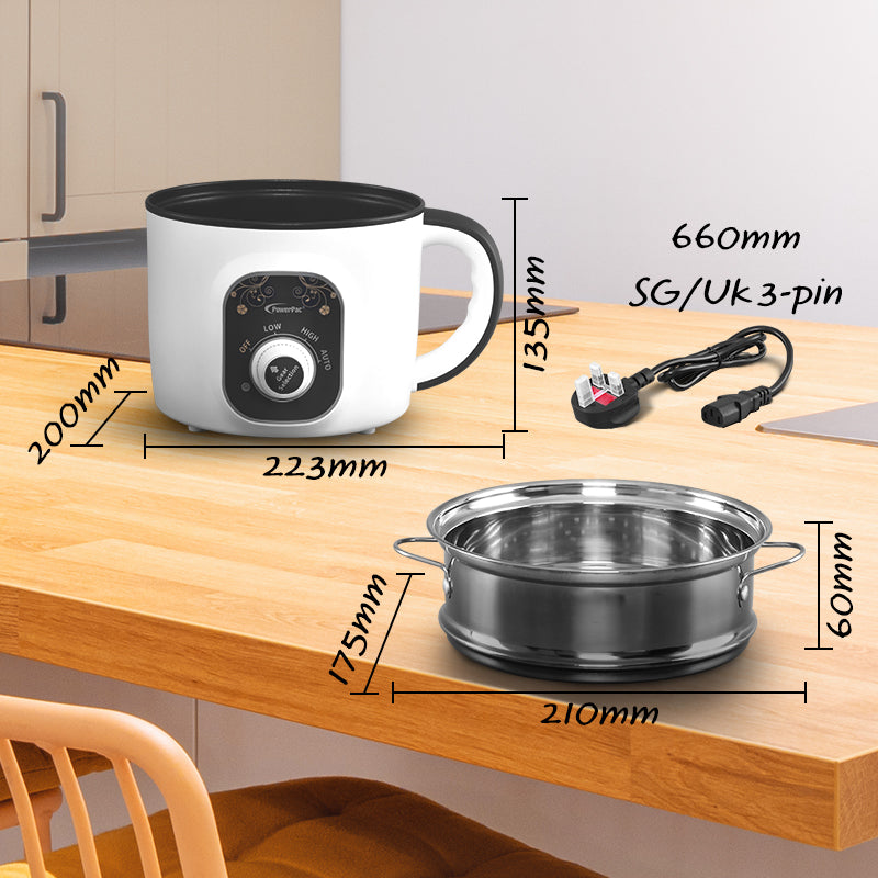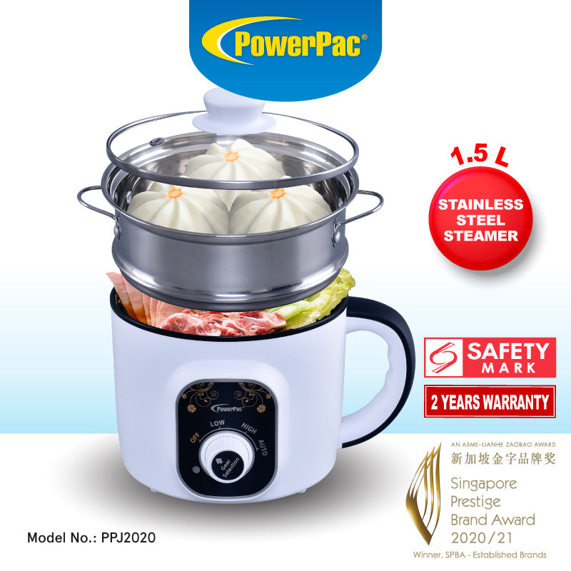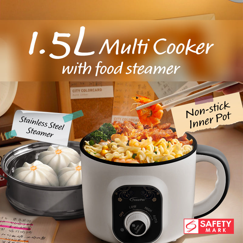 The PowerPac 1.5 Multi-Cooker Noodle Cooker Steamboat with Steamer PPJ2020 carries out the cooking functions of many appliances all within one versatile and time-saving tabletop electric appliance, freeing up your modern kitchen's limited space.