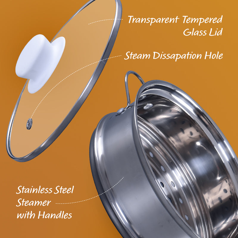 - Product Dimensions: Length (With Handle): 224mm, Width: 170mm, Height (With steamer but no lid): 191mm, Base: 132mm, Height of pot only: 138mm, Pot Depth: 91mm, Pot Diameter: 160mm, Steamer Length (With Handle): 206mm, Steamer Diameter: 175mm, Steamer Depth: 61mm