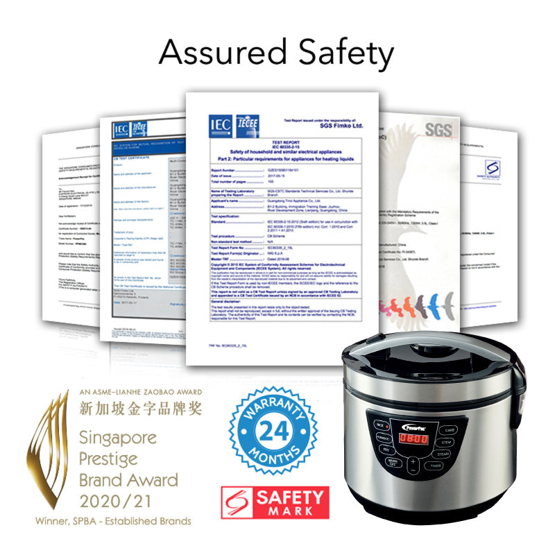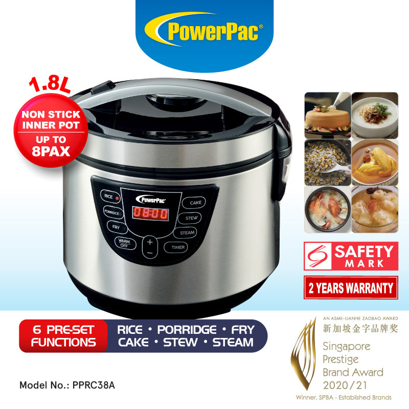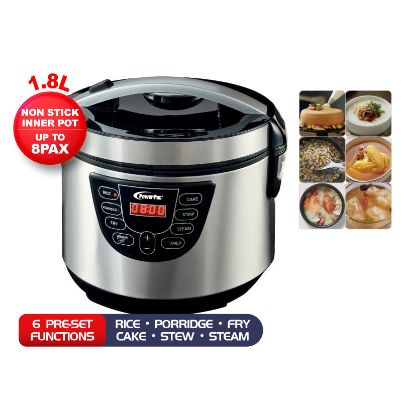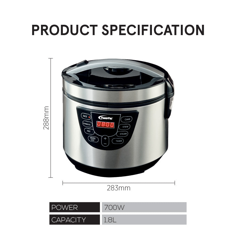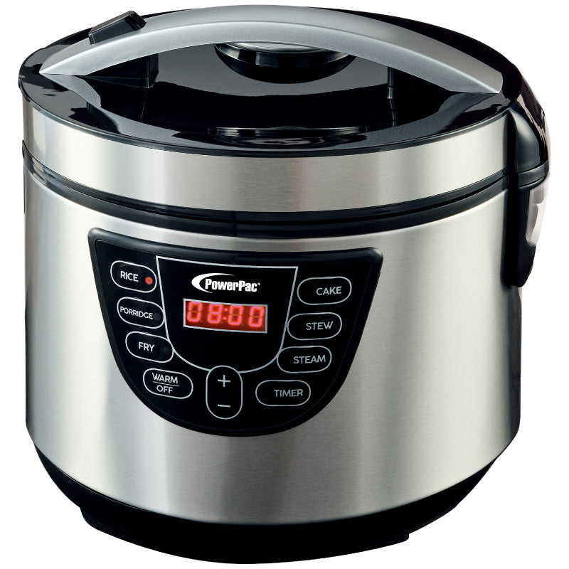 The PowerPac 1.8L Digital Multi-cooker with Non-Stick Inner Pot PPRC38 combines the functions of many appliances into one unit. It is a rice cooker, electric fryer, steamer, slow cooker, and even bakes cakes, all packaged in a single, versatile and time-saving tabletop appliance, freeing up our modern kitchens' already limited space.