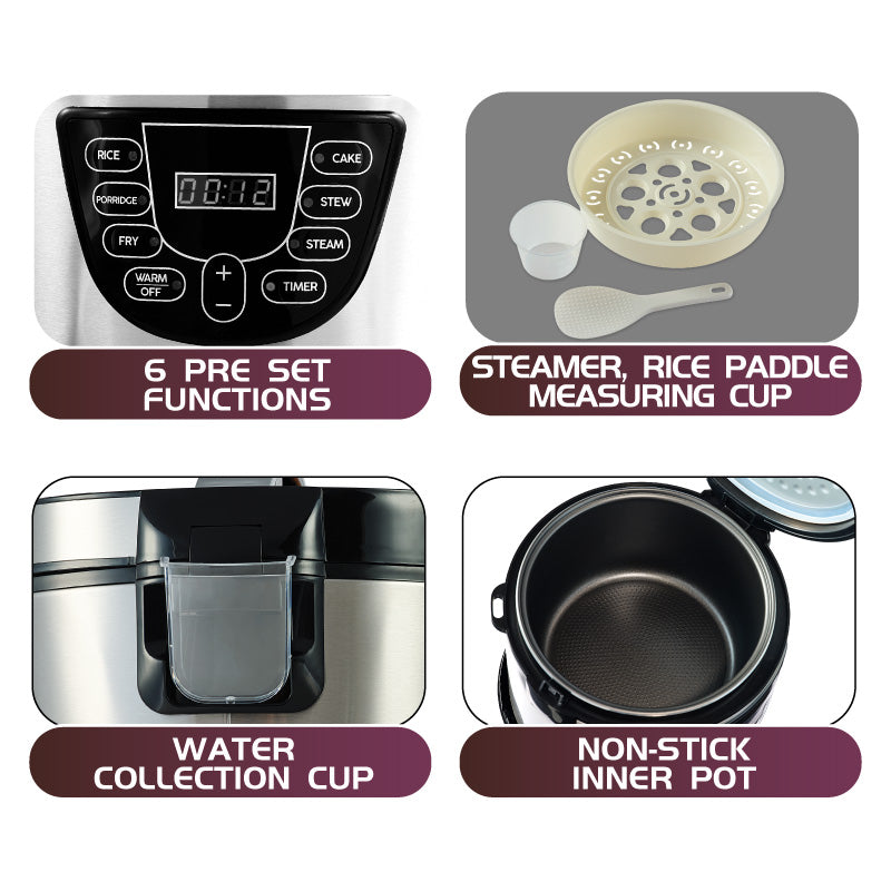 - Programmable up to 6 settings for different types of cooking (Frying, stewing and steaming)