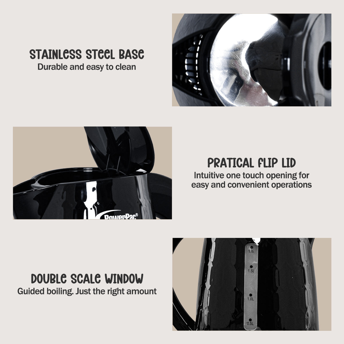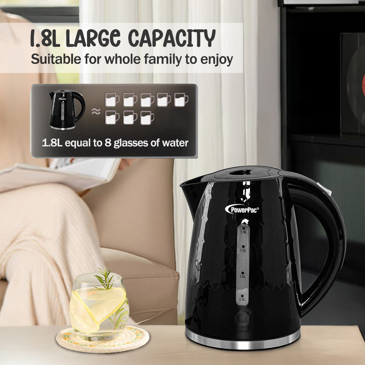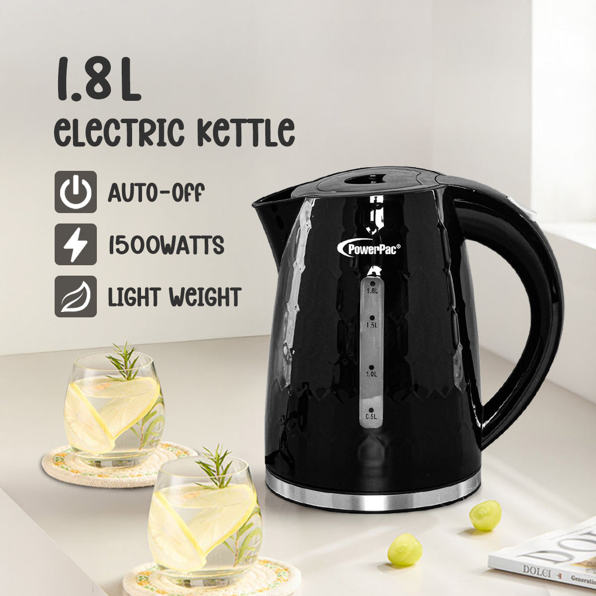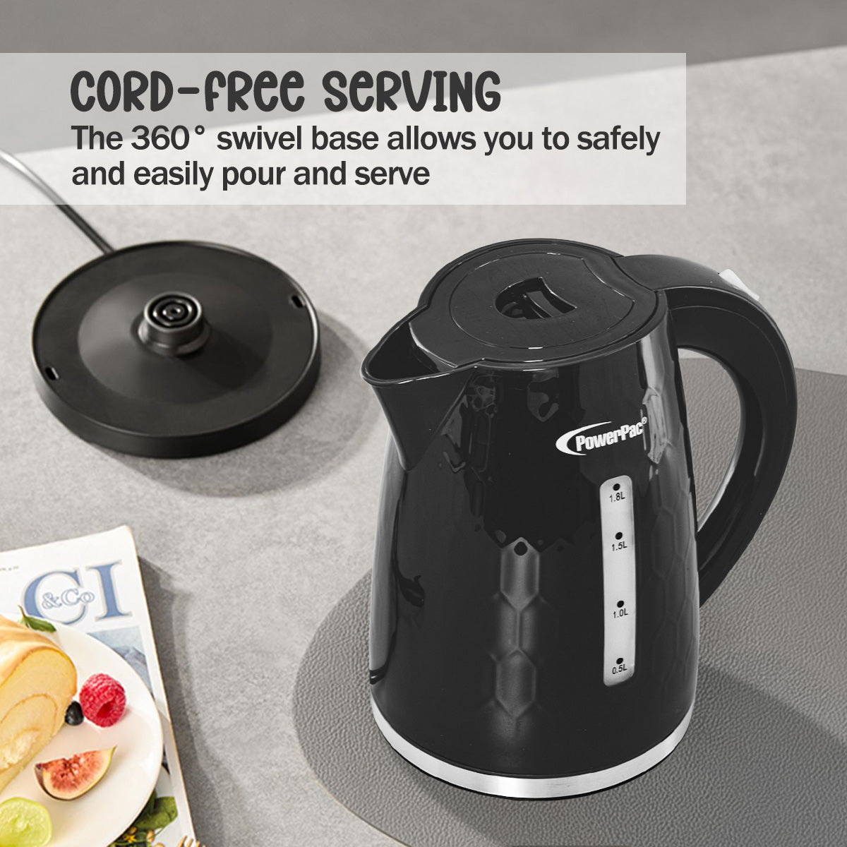 The PowerPac Cordless Kettle Jug with UK Controller 1.8L BPA-FREE PPJ2010 is a dependable, safe and easy-to-use kitchen appliance.