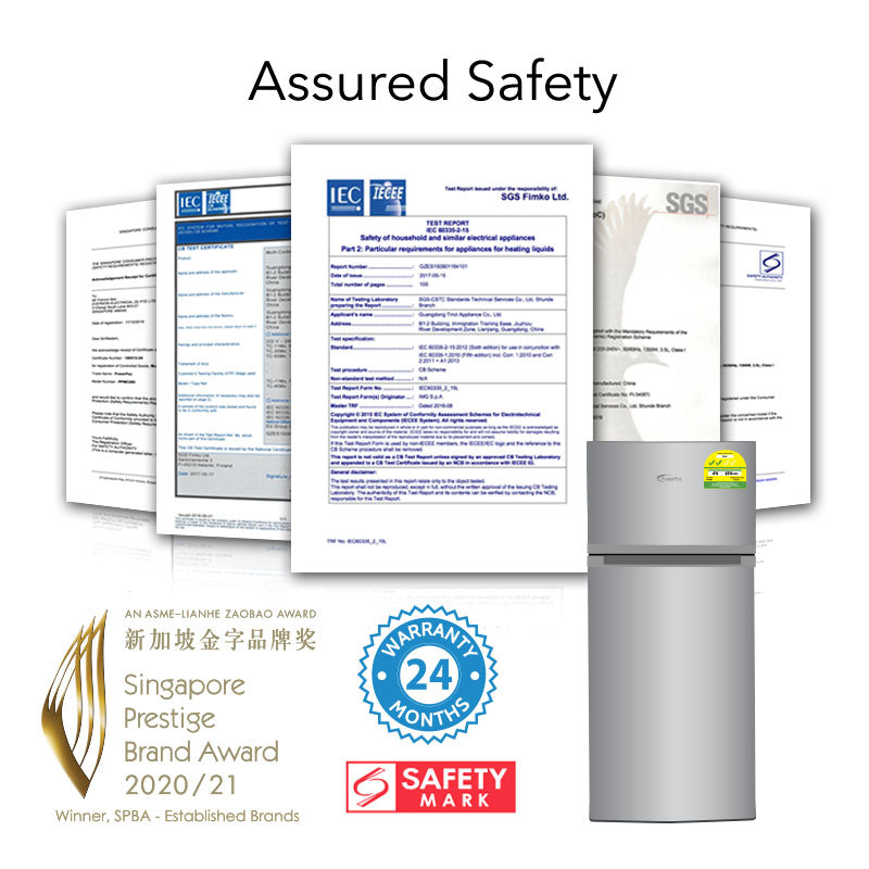 Certified for safety (Safety Mark: 170494-24) and designed for secure, efficient cooling, the PowerPac 2-Door Mini Bar Fridge with Freezer PPF136 is an ideal solution for keeping your food and beverages fresh, hygienic, and easily accessible.