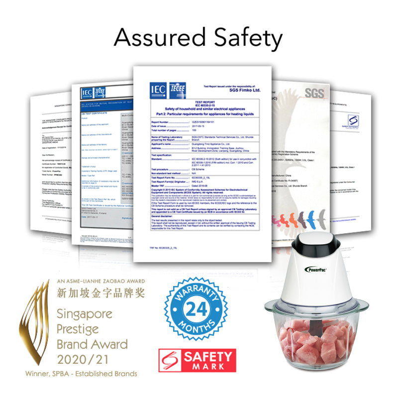 Firstly, using the PowerPac Food Chopper PPCP813 eliminates potential nasty accidents while chopping and cutting raw food like meat. Secondly, the PPCP813 is multi-functional. It is used primarily as a Chopper and Mincer, chopping and mincing ingredients like garlic, ginger, chillies, onions, nuts and meat. Additionally, it purees and, to a certain extent, blends fruits and vegetables. Thirdly, the PPCP813 reduces direct contact with raw food. Its stainless steel blades are much cleaner than fingers and help keep bacteria at bay. Fourthly, cooking becomes more enjoyable as the PPCP813 does all the hard work and cuts down food preparation time considerably! Lastly, the PPCP813 gives your kitchen a modern look.