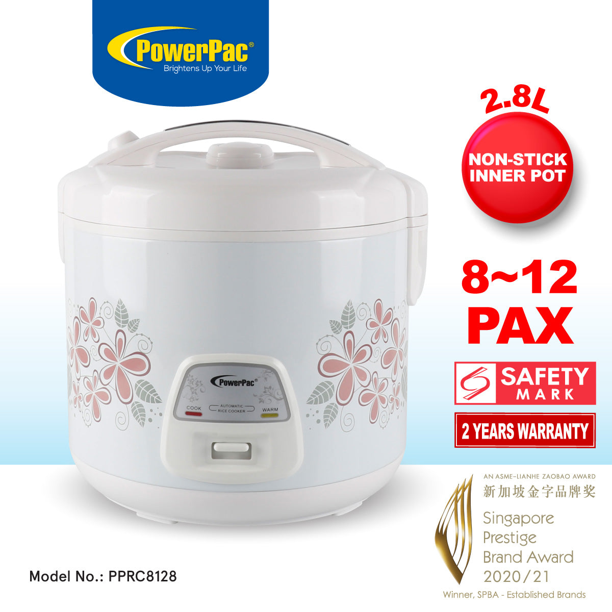 The premium PowerPac 2.8L Rice Cooker with Steamer PPRC8128 possesses the following features: a large Heating Plate to accelerate the heating process; a non-stick aluminium Inner Pot; a Vapour Hole which lets just the right amount of steam out; and a Water Storage Box to keep condensation away from the rice. Its safety features include Auto Warm function which automatically changes from COOK to WARM when the cooking time has expired. It is safe, easy to operate, is energy efficient, and will provide fluffy rice for many years to come.
