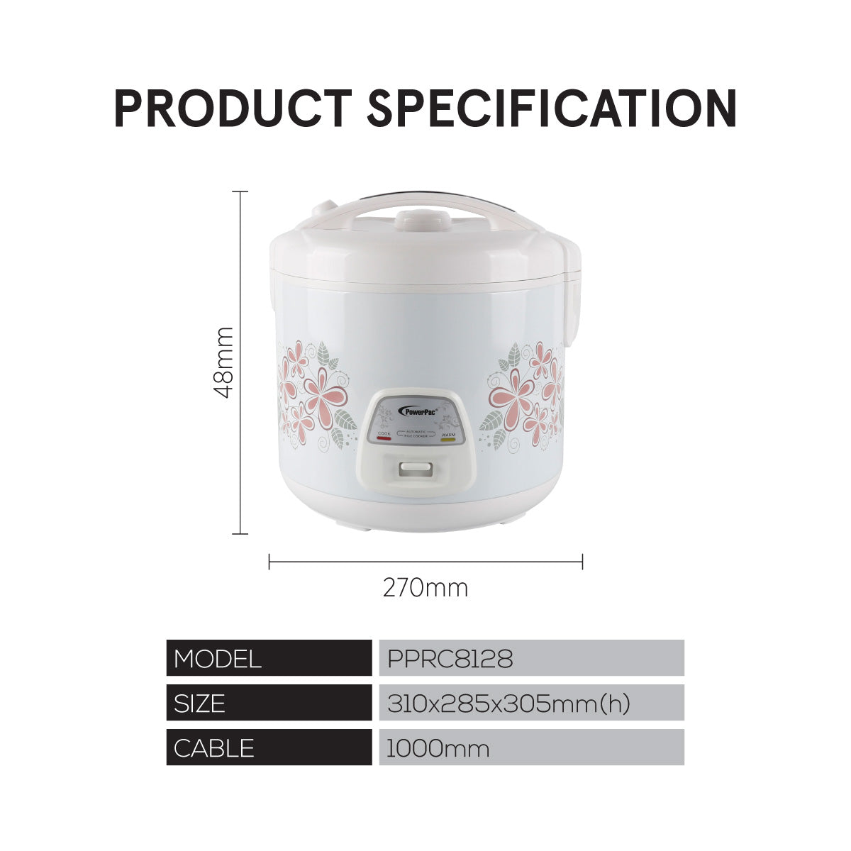- PPRC8128- 2.8L, Voltage 220-240, 50-60 Hz, Power 1000 Watts, Safety Mark 210174
