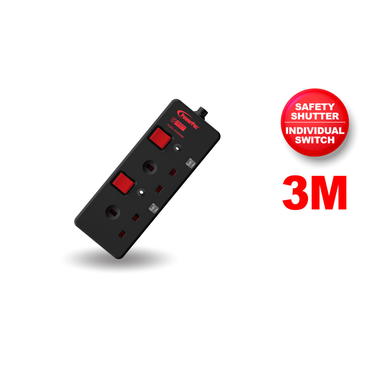 This is one of PowerPac's most popular Safety Extension Sockets! The full range, which comes in white or black, comprises power cable lengths of 3 m, and is equipped with between 1 to 6 electrical sockets on the powerboard. This model in black, PP3882BK, comes with 2 electrical sockets. The individual socket switches are individually LED-lit.