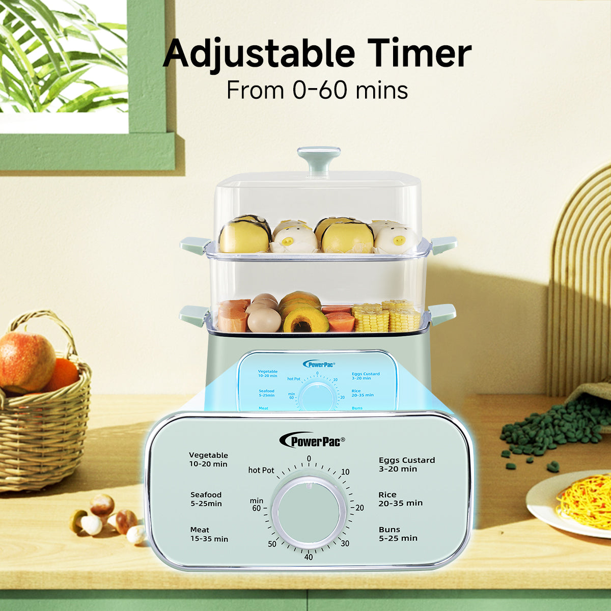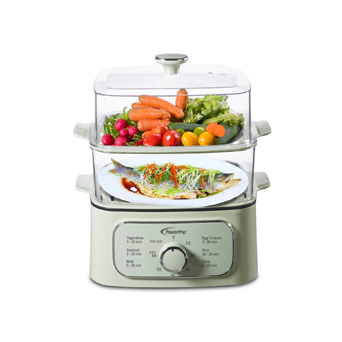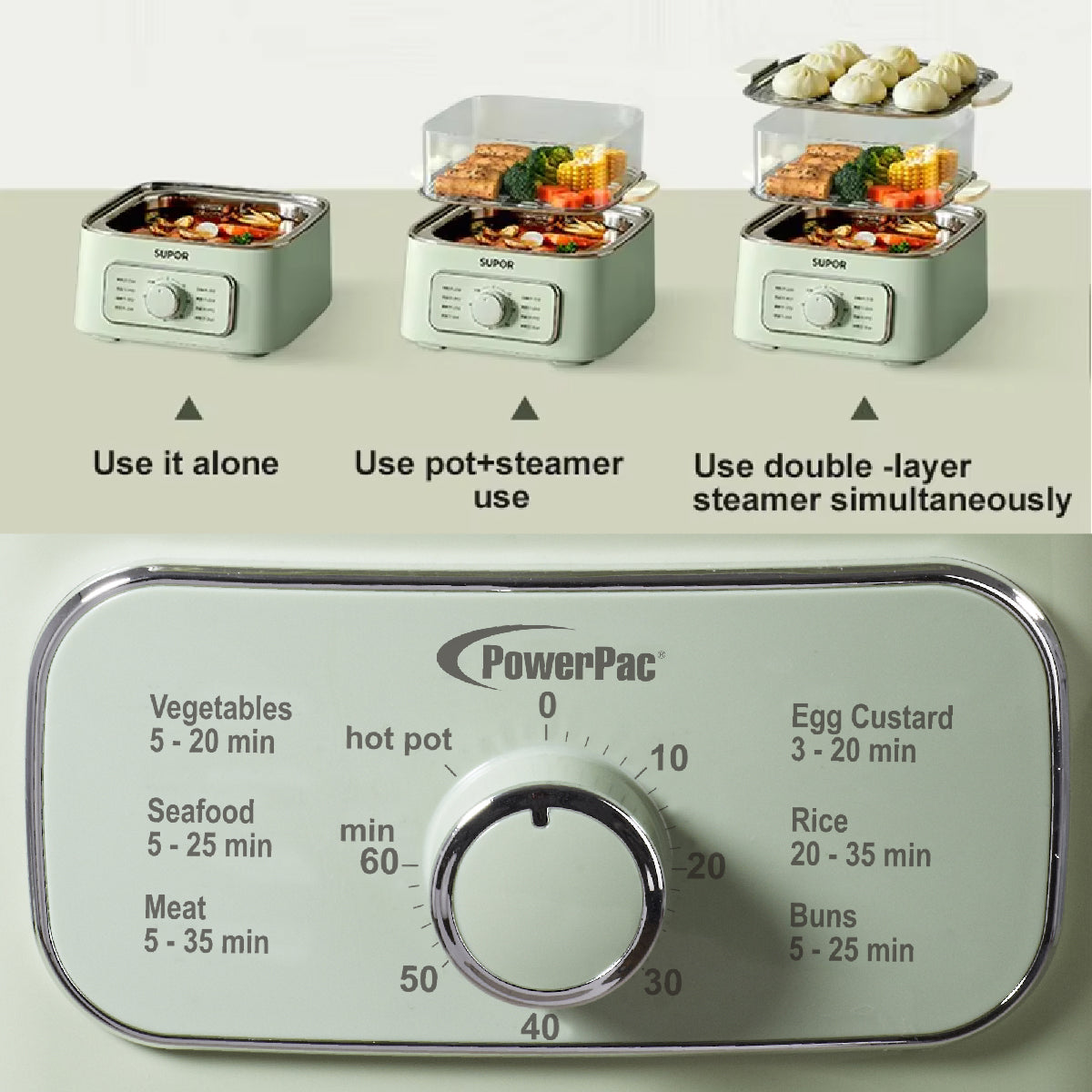 With its compact, stackable design, the PowerPac 2in1 Multi-function 2-Tier Food Steamer & Steamboat PPS704 provides a convenient, efficient, and safe way to steam, fry, deep-fry, stir-fry, stew, and steamboat. Fill the non-stick Inner Pot with water, place food on the Shelf together with the Steam Rack. Place food on another Shelf over it, together with another Steam Rack and place the Cover (with Steam Vent Holes) on top. The 60-minute Timer with auto shut-off function and thermal fuse permits you to set the timer and walk away while the steamer cooks your food to perfection. You can boil soup or cook rice in the Inner Pot, saving time and energy, too. Remove the trays above the Inner Pot, add some oil and you can use the Inner Pot as a Fryer or Grill. Add a lot of oil, and use it as a Deep-Fryer. Add soup, sauces and ingredients and use it as a Hot Pot. Place the Hot Pot at the centre of the table, and everybody can sit around it and enjoy the food placed in it. With a 9.2L capacity, you can cook enough food for multiple people at one go.
