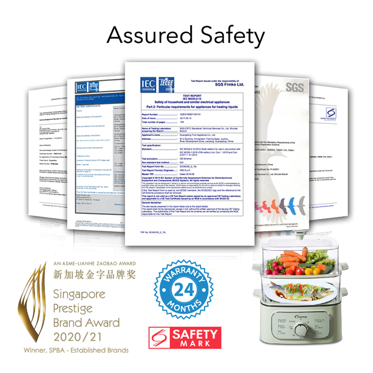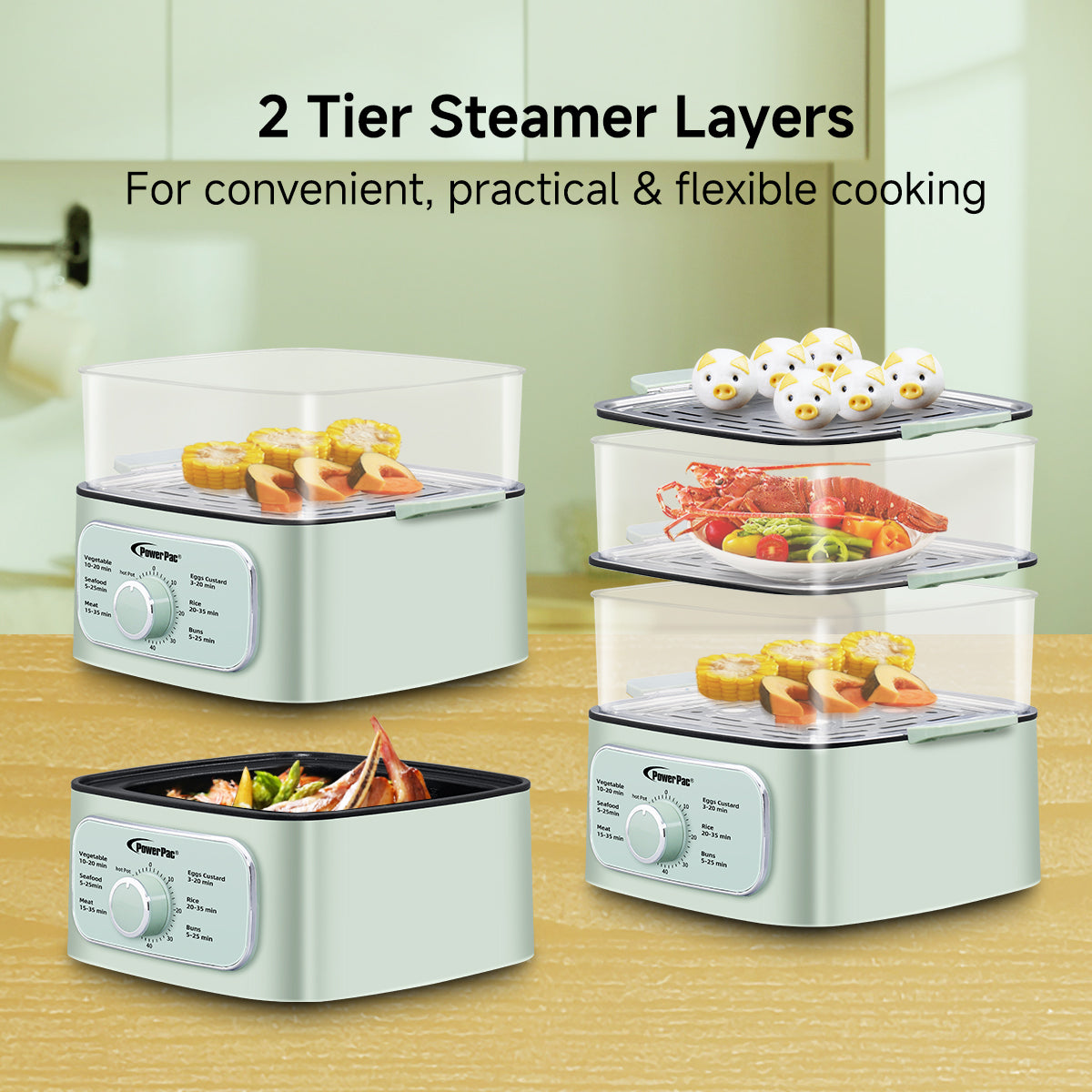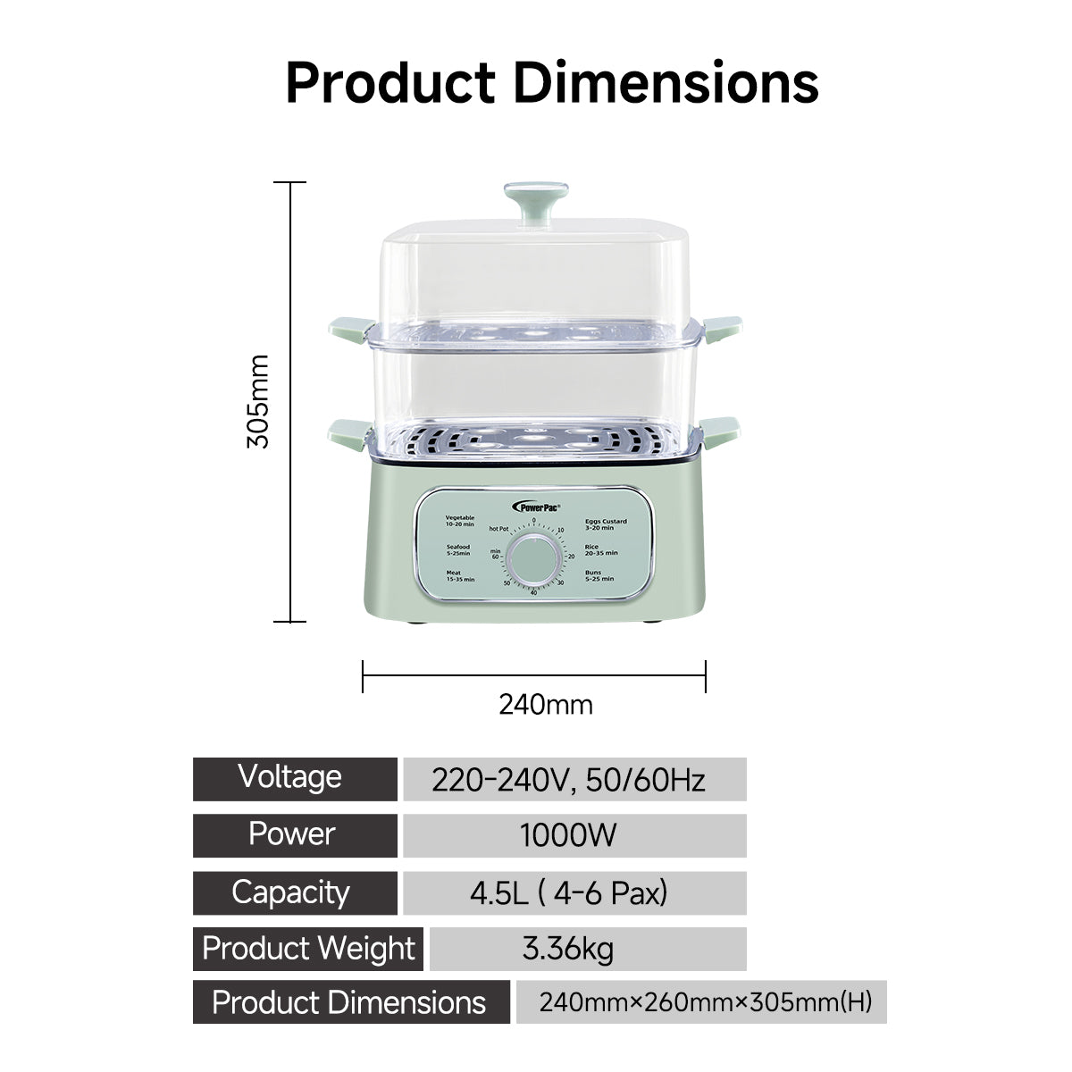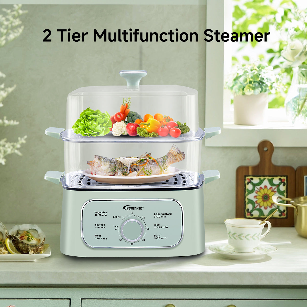 With its compact, stackable design, the PowerPac 2in1 Multi-function 2-Tier Food Steamer & Steamboat PPS704 provides a convenient, efficient, and safe way to steam, fry, deep-fry, stir-fry, stew, and steamboat. Fill the non-stick Inner Pot with water, place food on the Shelf together with the Steam Rack. Place food on another Shelf over it, together with another Steam Rack and place the Cover (with Steam Vent Holes) on top. The 60-minute Timer with auto shut-off function and thermal fuse permits you to set the timer and walk away while the steamer cooks your food to perfection. You can boil soup or cook rice in the Inner Pot, saving time and energy, too. Remove the trays above the Inner Pot, add some oil and you can use the Inner Pot as a Fryer or Grill. Add a lot of oil, and use it as a Deep-Fryer. Add soup, sauces and ingredients and use it as a Hot Pot. Place the Hot Pot at the centre of the table, and everybody can sit around it and enjoy the food placed in it. With a 9.2L capacity, you can cook enough food for multiple people at one go.