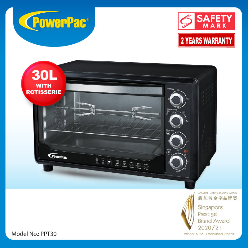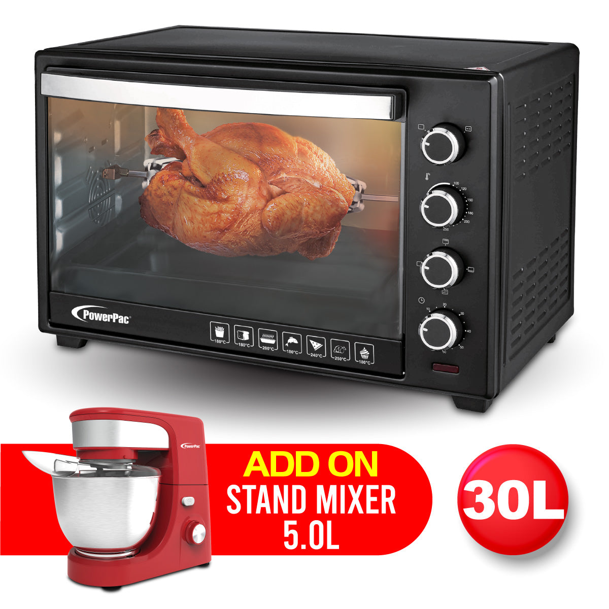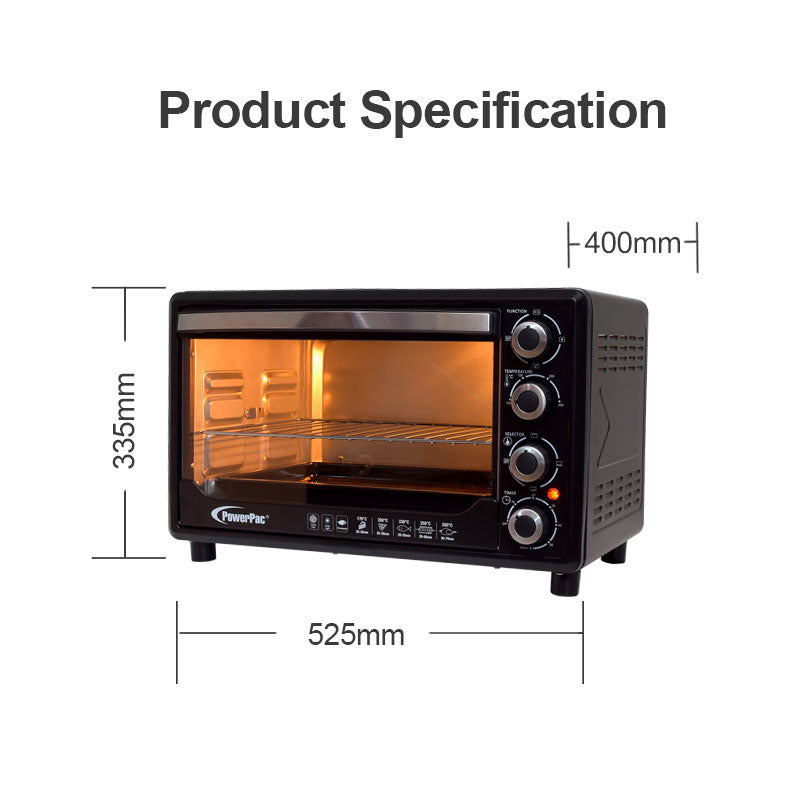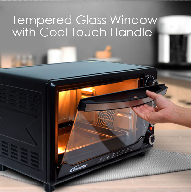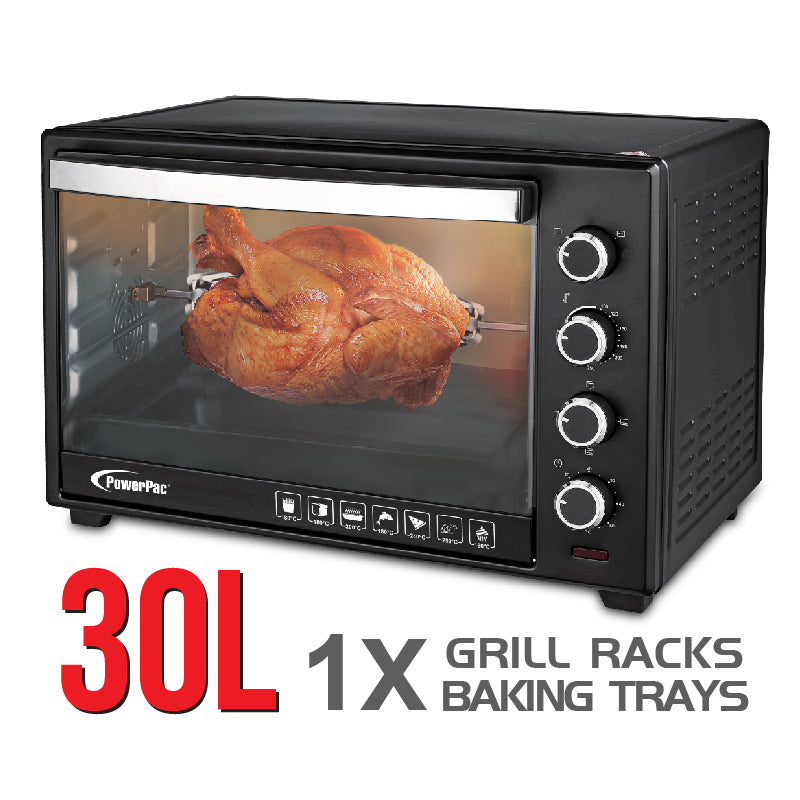 This PowerPac Electric Oven 30L PPT30 with 4 knobs control to optimise different settings, temperature control and operate the heating tubes. It is designed with cool touch handle to prevent any burnt to your palm and fingers.