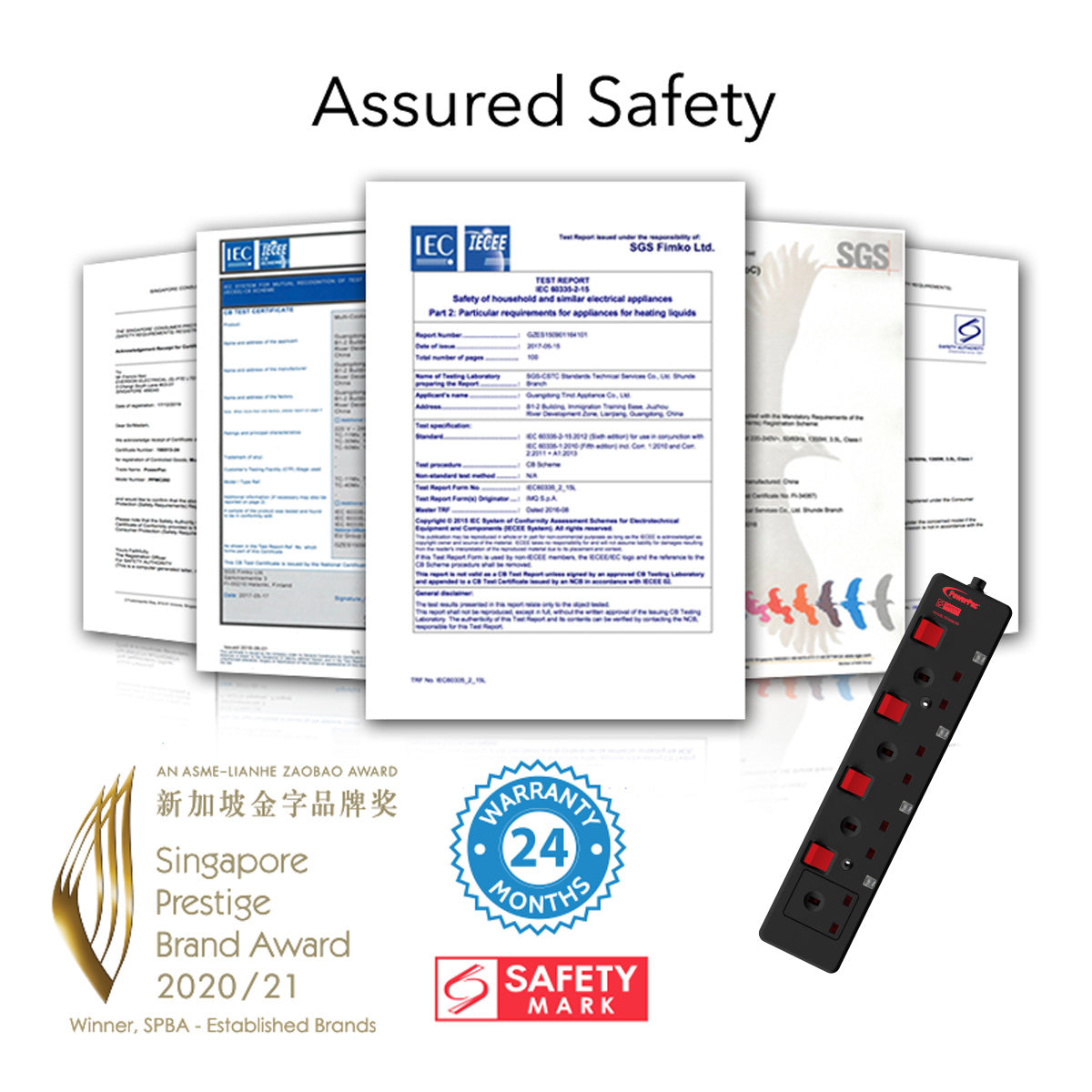 The PowerPac 3 Meter 4 Way Extension Cable PP3884BK is lightweight & compact and comes with Singapore's Safety Mark (090410-12) attesting to its safety.