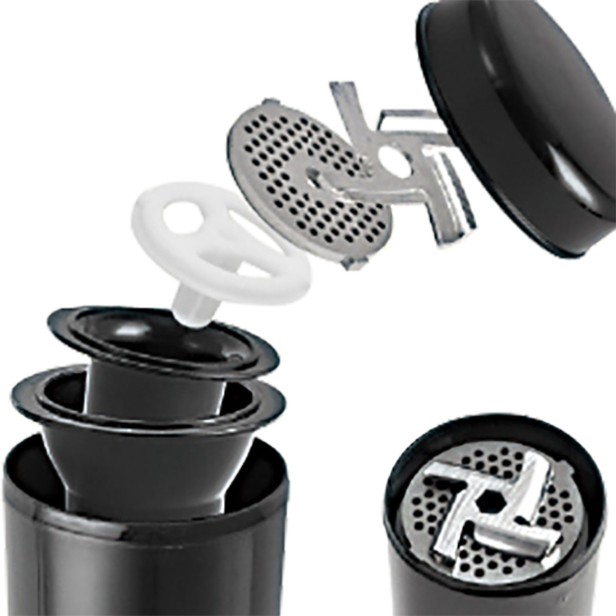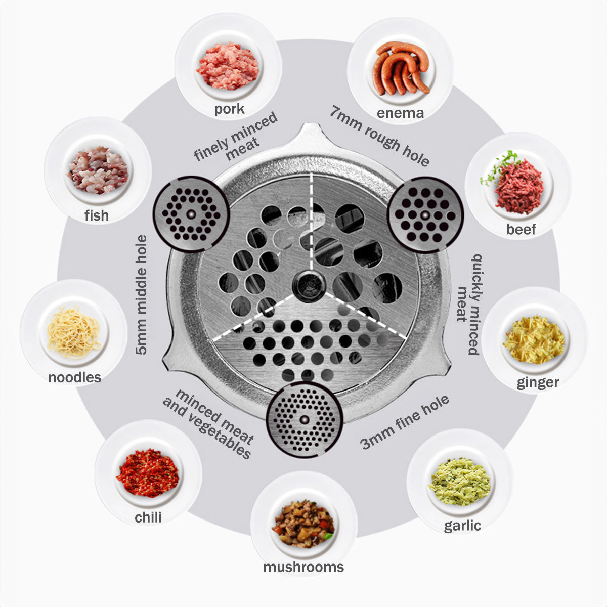 Various types of meat (beef, pork, chicken, fish, etc.), vegetables and spices (chilli, ginger, carrots, garlic), mushrooms, kubbe dough, you can even prepare your own noodles - all of them can be run through the three food-grade Stainless Steel Cutting Plates of various hole sizes (3 mm, 5 mm and 7 mm).