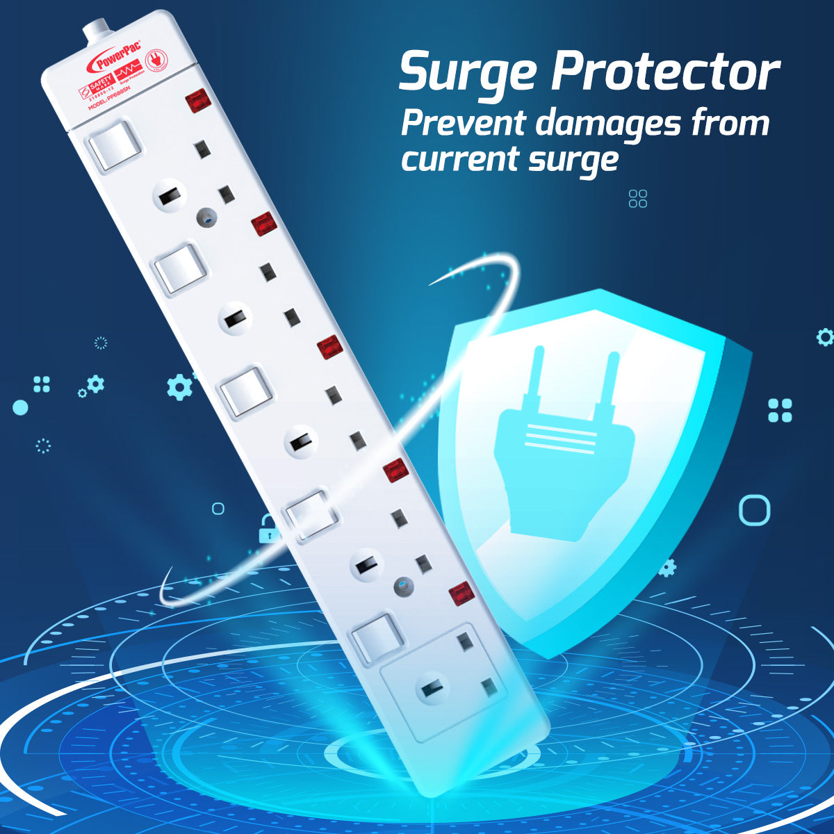 - Surge protector preventing damages to appliances due to current surge.