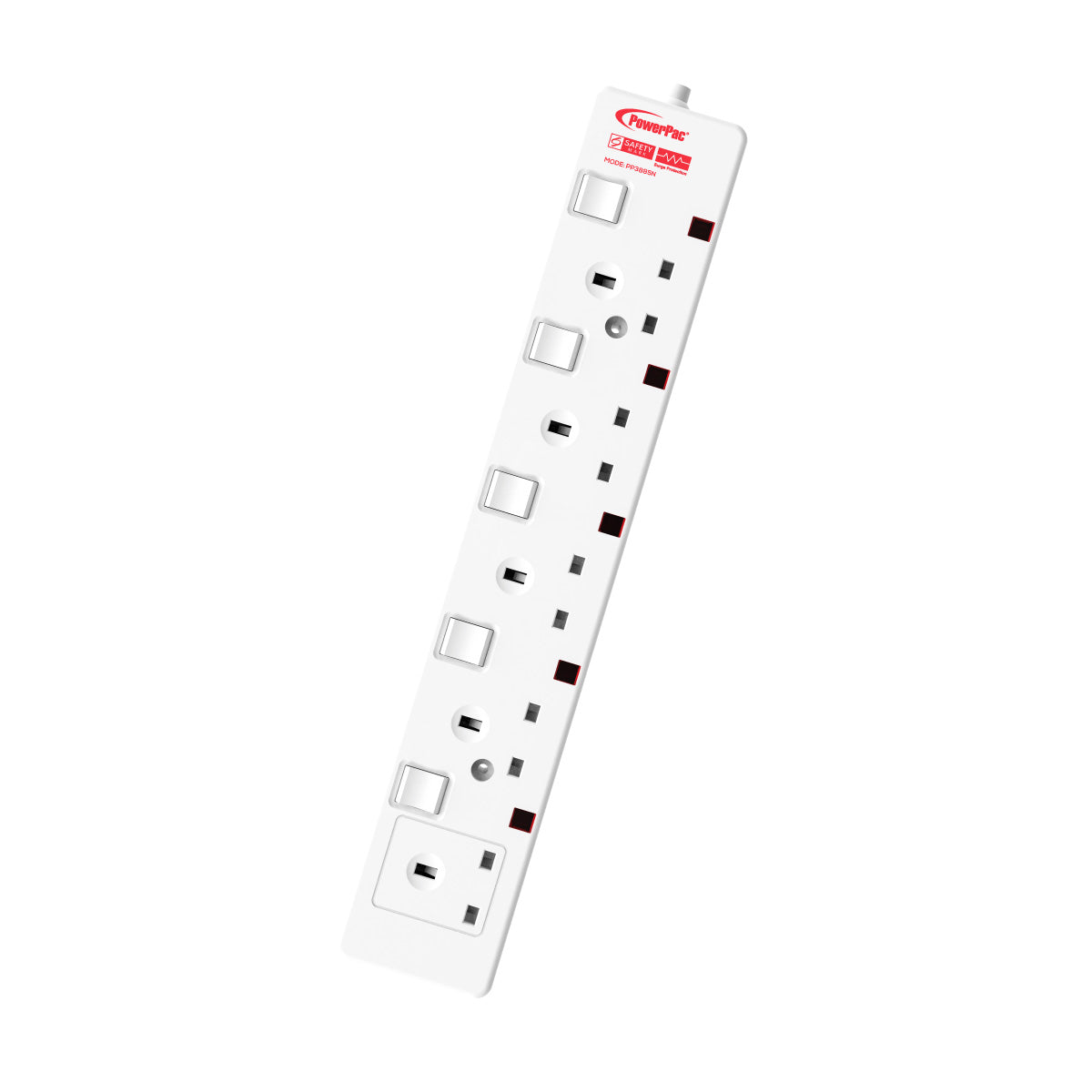 This is one of PowerPac's most popular Safety Extension Sockets! The full range, which comes in white or black, comprises power cable lengths of 6 m, and is equipped with between 1 to 6 electrical sockets on the powerboard. This model in white, PP6885N, comes with 5 electrical sockets. The individual socket switches are individually LED-lit. With 2-Pin direct, inserting 2-Pin plugs into the sockets no longer require any plastic adapters.