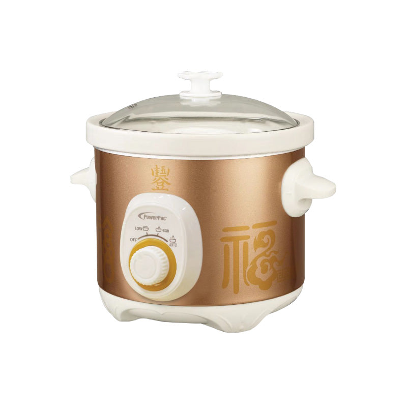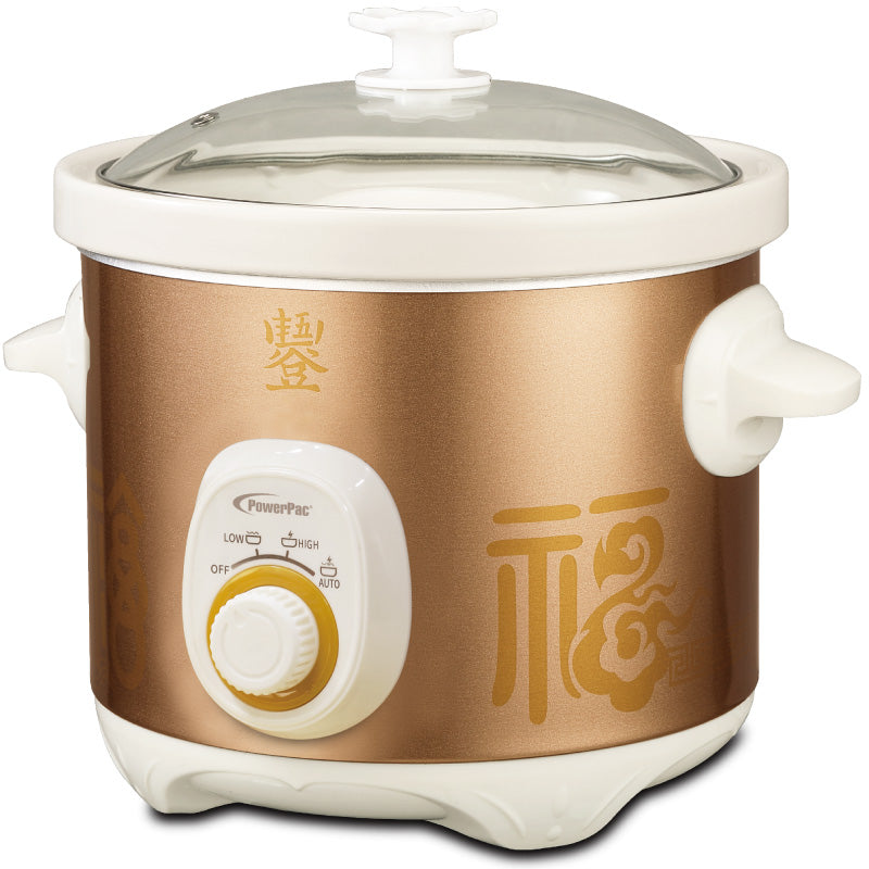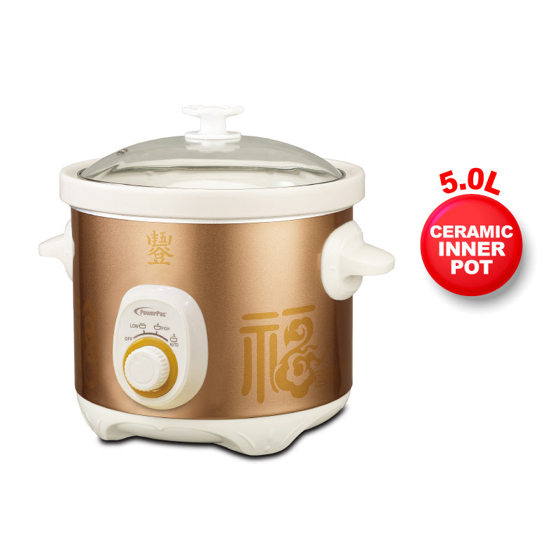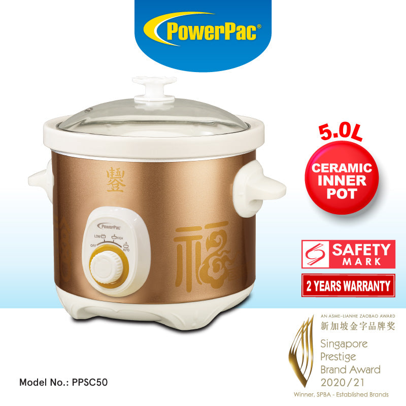 This PowerPac Slow Cooker PPSC50 can be used for cooking porridge, chowders, stews as well as preparing various types of soups (especially herbal soup, chicken soup & fish soup) & purees (corn, pumpkin, etc.), desserts as well as scented teas. It is especially useful in preparing homemade food for babies & toddlers. It possesses the following features: a removable 5.0 L Ceramic Pot with a removable Glass Lid, a large heating plate as well as side heating to accelerate the heating process, and is easy to use. The use of high quality ceramic helps retain the flavour of foods whilst maintaining moisture and nutrients.