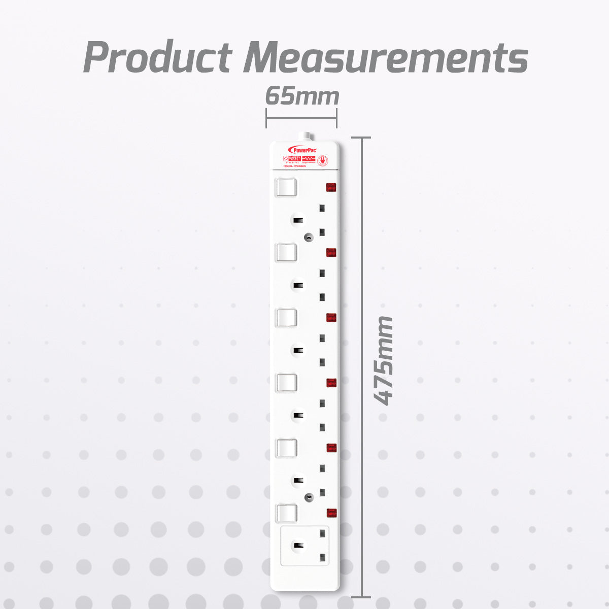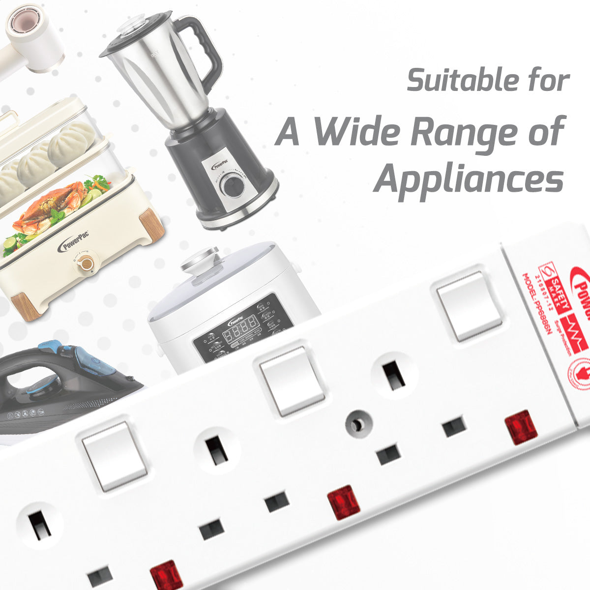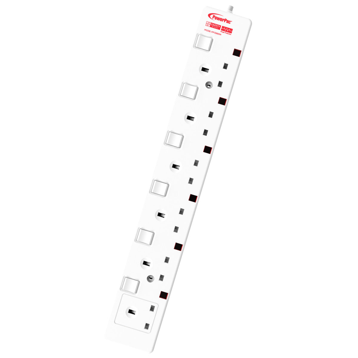 This is one of PowerPac's most popular Safety Extension Sockets! The full range, which comes in white or black, comprises power cable lengths of 6 m, and is equipped with between 1 to 6 electrical sockets on the powerboard. This model in white, PP6886N, comes with 6 electrical sockets. The individual socket switches are individually LED-lit. With 2-Pin direct, inserting 2-Pin plugs into the sockets no longer require any plastic adapters.
