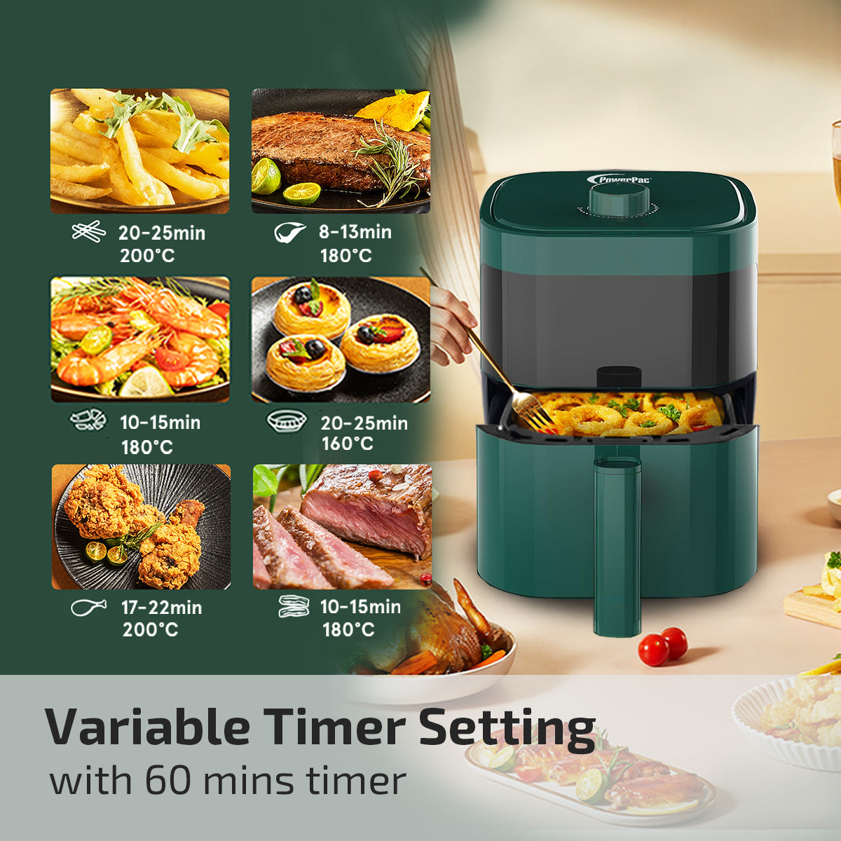 The PowerPac 3L Air Fryer with hot air flow system PPAF636A has a Temperature knob which can regulate temperature from 80 to 200 degrees Celsius (176 to 392 degrees Fahrenheit) and comes with various settings like Defrost, Fries, Fish, Meat & Pizza, so you wouldn't need to second guess the ideal cooking temperature. It also comes with a Timer knob which can operate up to 30 minutes.