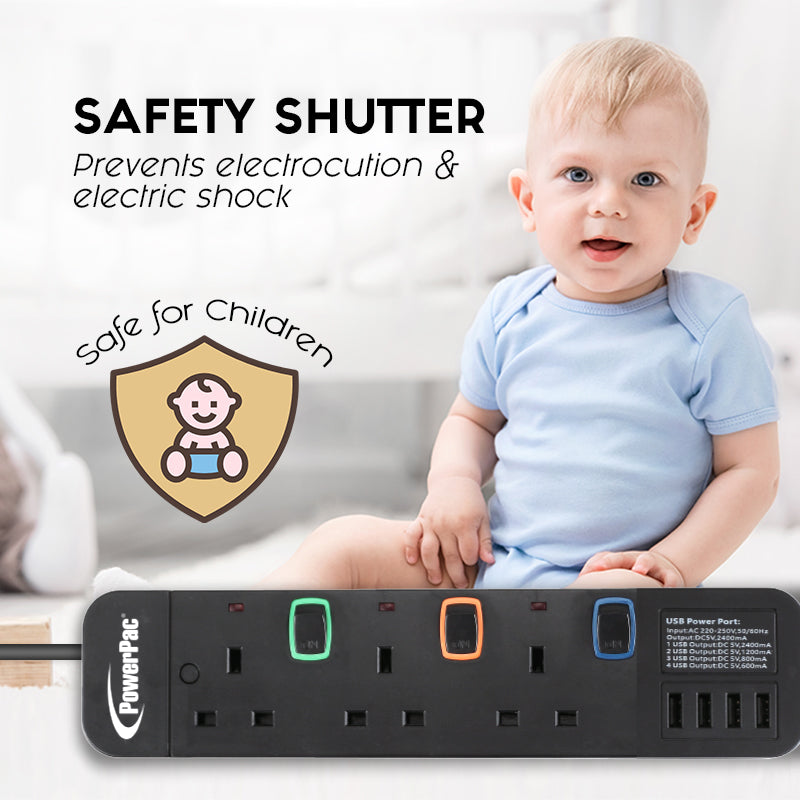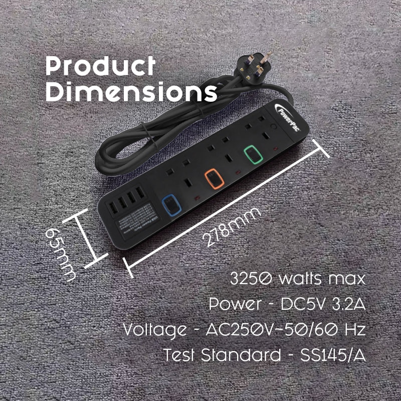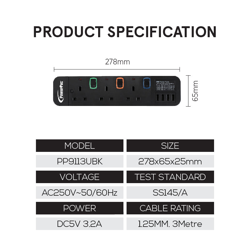 Extension Socket Extension Cord Power Cord 3 way 3 meter 4x USB Charger (PP9113UBK)
