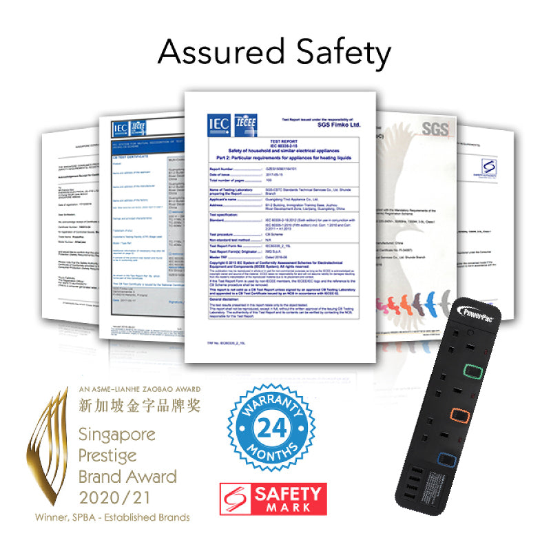 It has 3 important safety features: Built-in Surge Protector safeguards electronic devices such as your TV system or computer from high-voltage power surges; while Safety Shutter prevents children from tampering with the device. All materials are Fire-retardant.
