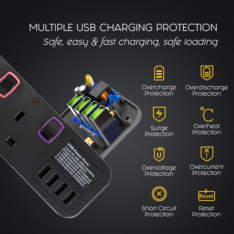 With built-in USB Sockets, you do not have to purchase cumbersome 3-pin adapters and so free up your 3-pin wall sockets, nor leave your computer or laptop switched on, which would use a lot of electricity and take longer to charge. You can lay the powerboard on the floor or table, or mount it on the wall, where you can conveniently insert or detach USB cables and 2 or 3 pin plugs simultaneously.