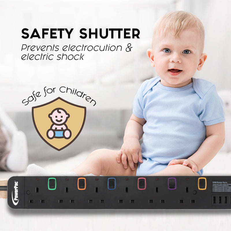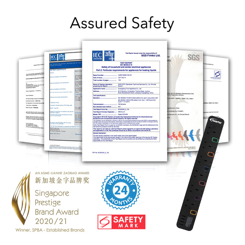 It has 3 important safety features: Built-in Surge Protector safeguards electronic devices such as your TV system or computer from high-voltage power surges; while Safety Shutter prevents children from tampering with the device. All materials are Fire-retardant.