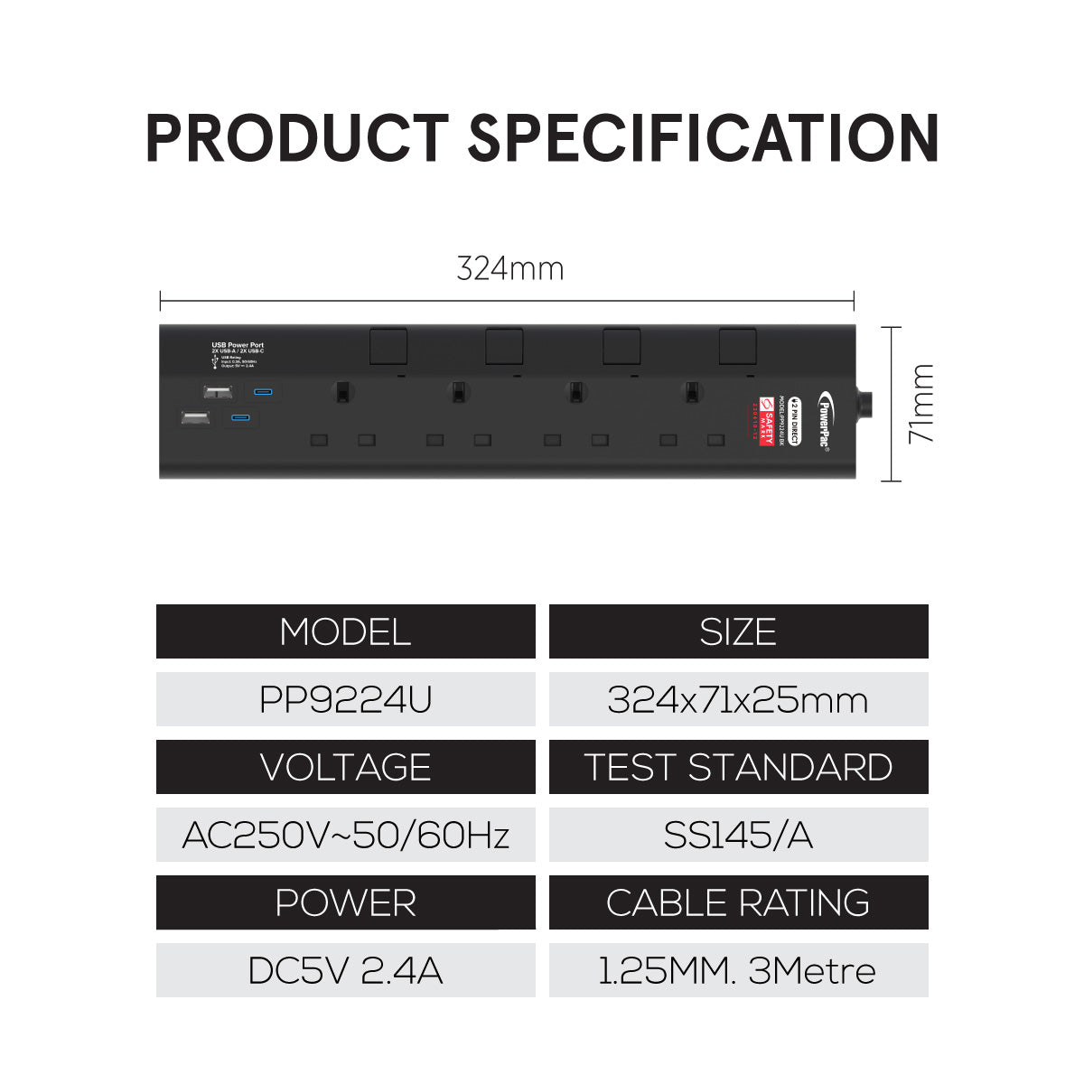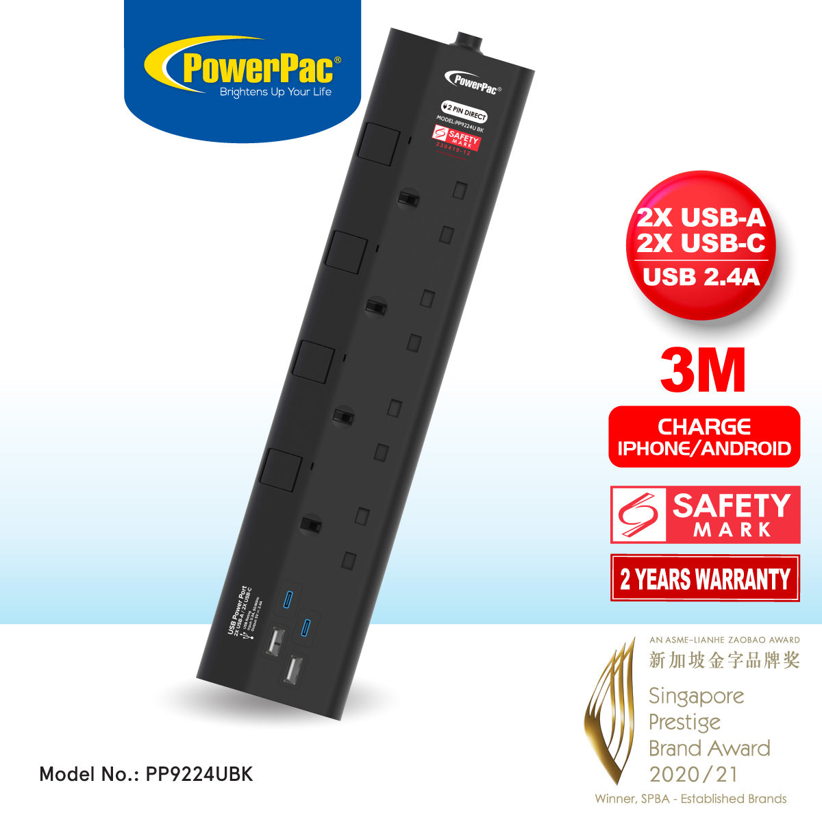 The PowerPac 4 Way Extension Cable with USB Charger, 2 USB A and 2 USB C Sockets PP9224U is lightweight & compact and comes with Singapore's Safety Mark (230410-12) attesting to its safety.