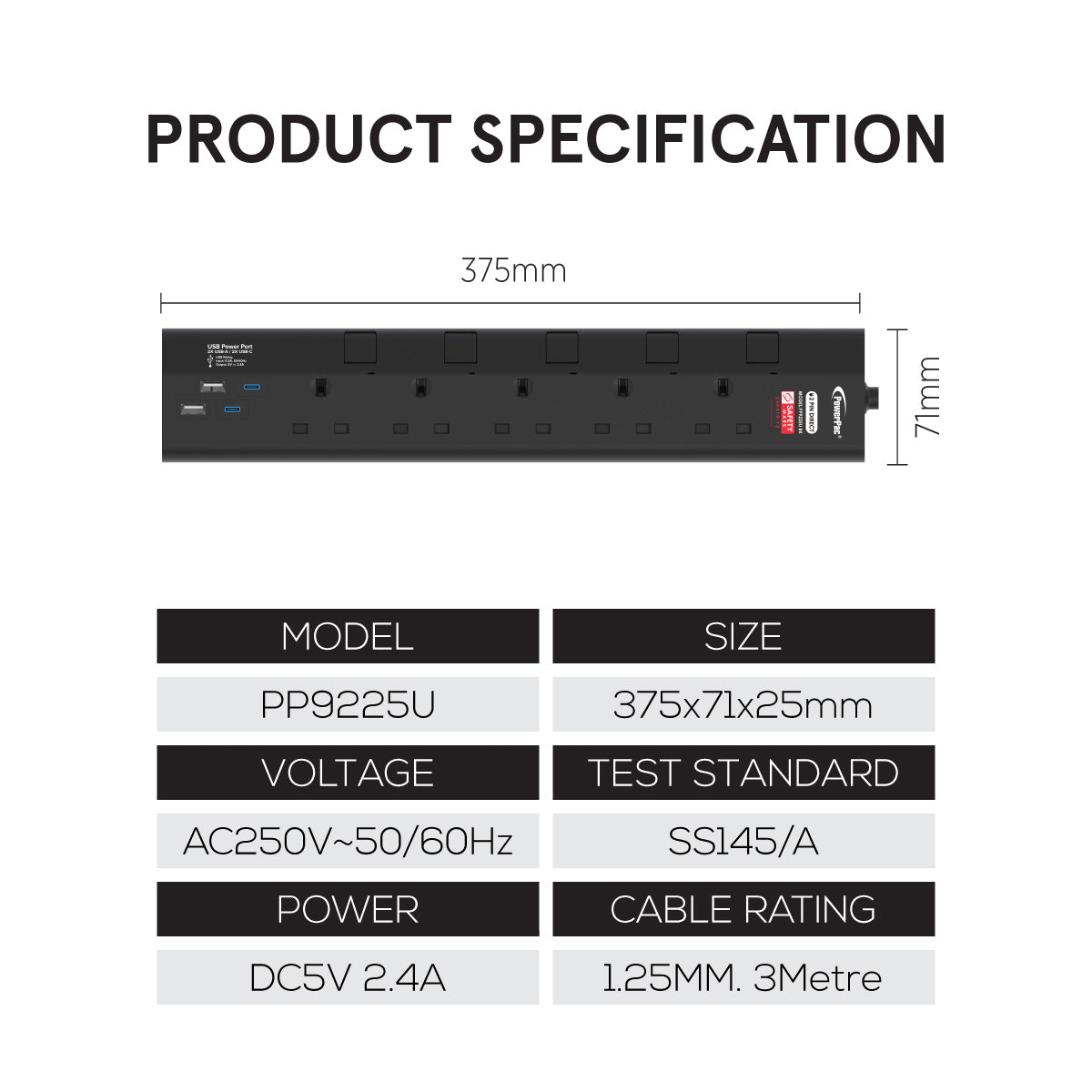 The PowerPac 5 Way Extension Cable with USB Charger, 2 USB A and 2 USB C Sockets PP9225U is lightweight & compact and comes with Singapore's Safety Mark (240310-12) attesting to its safety.