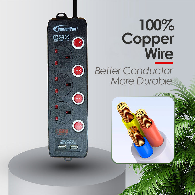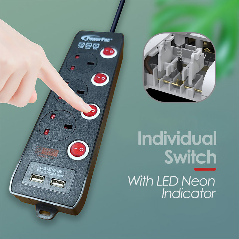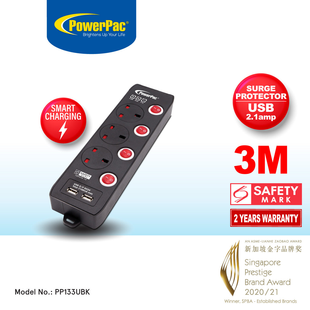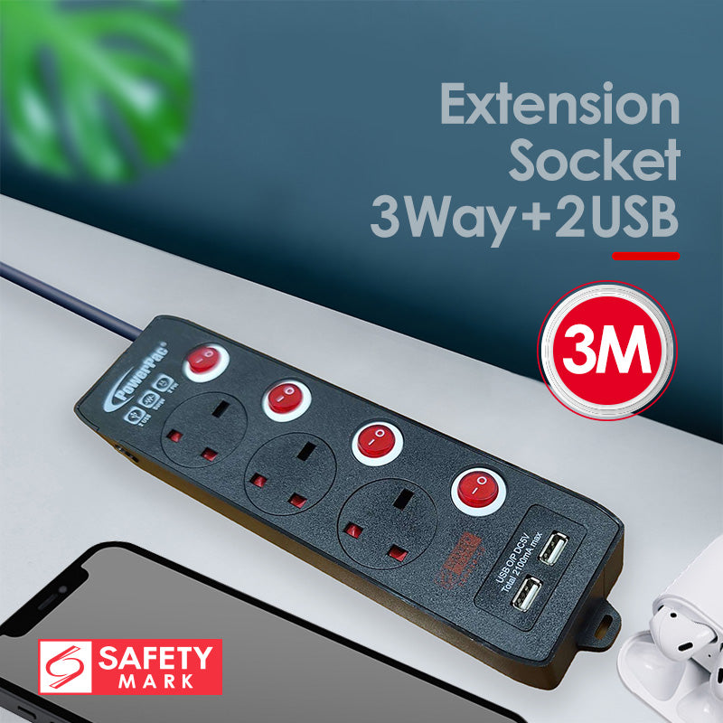 The PowerPac 3 Meter 3 Way Extension Cable with 2 USB Charger PP133UBK is lightweight & compact and comes with Singapore's Safety Mark (160038-12) attesting to its safety.