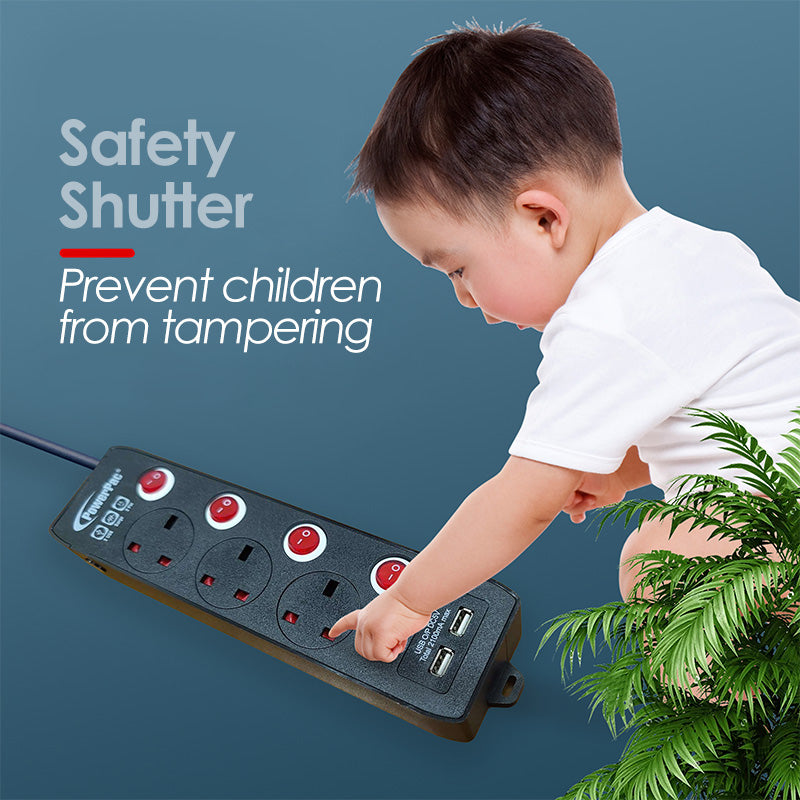 3 important safety features: Built-in Surge Protector safeguards electronic devices such as your TV system or computer from high-voltage power surges; while Safety Shutter prevents children from tampering with the device. All materials are Fire-retardant.