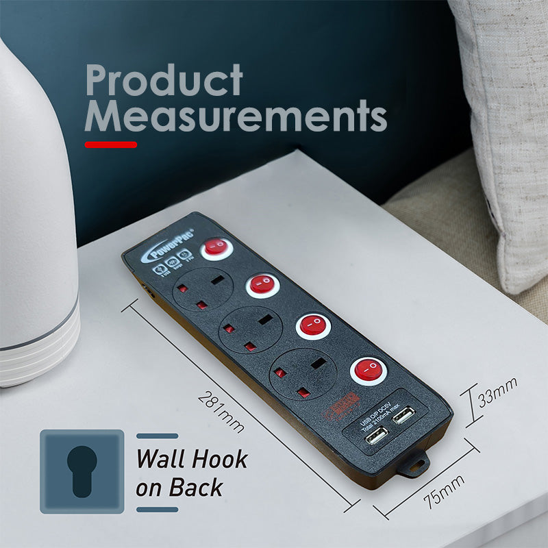 Presenting our most versatile range of Safety Extension Sockets, with 2 built-in USB Sockets! The full range, which comes in white or black, comprises power cable lengths of 3 m, and is equipped with 3, 4 or 5 electrical sockets on the powerboard. This model in black, PP133UBK, comes with 3 electrical sockets. The individual socket and USB switches are individually LED-lit.