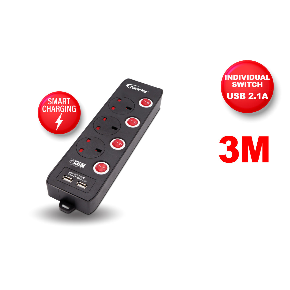 The PowerPac 3 Metre 3 Way Extension Cable with 2 USB Charger PP133UBK is lightweight & compact and comes with Singapore's Safety Mark (160038-12) attesting to its safety.