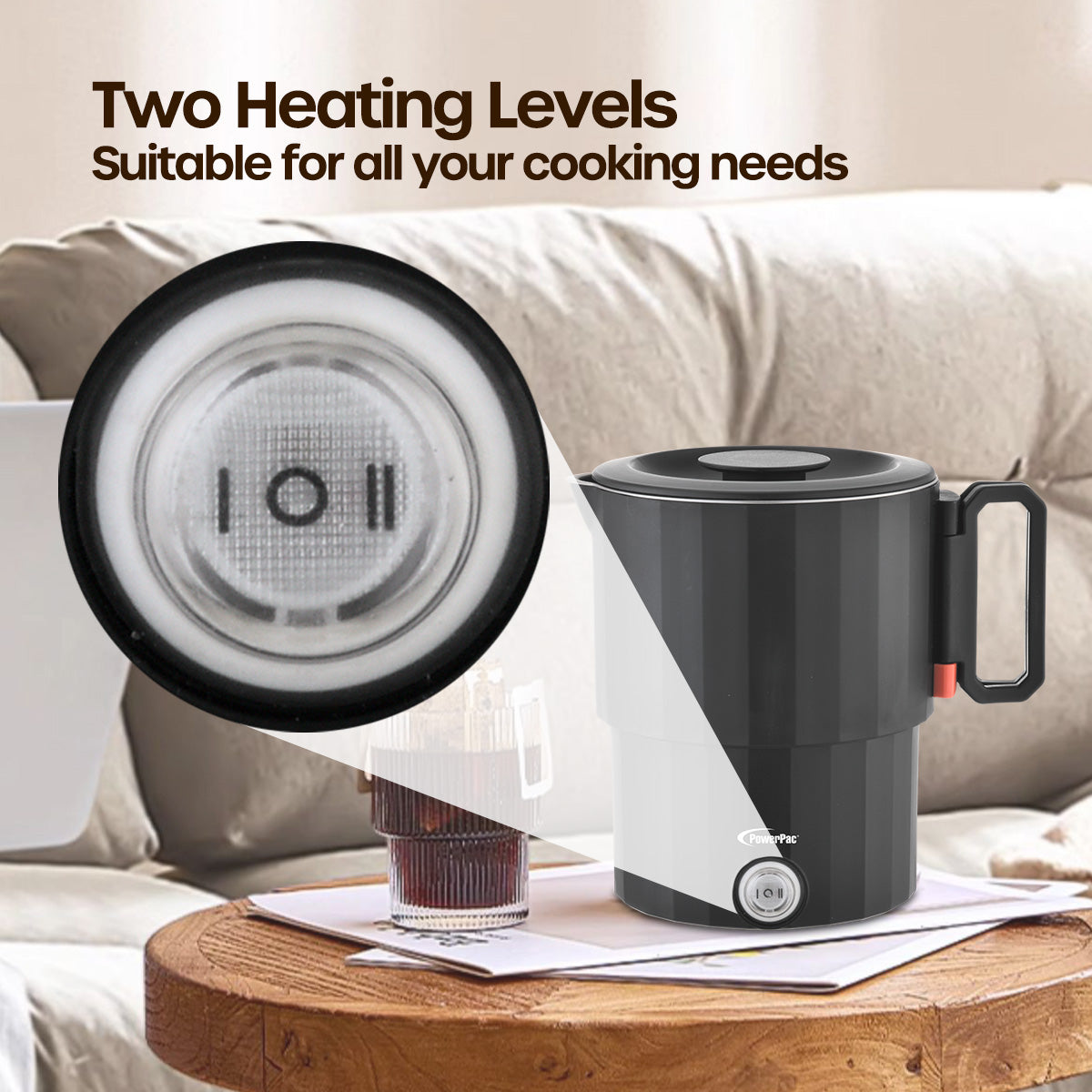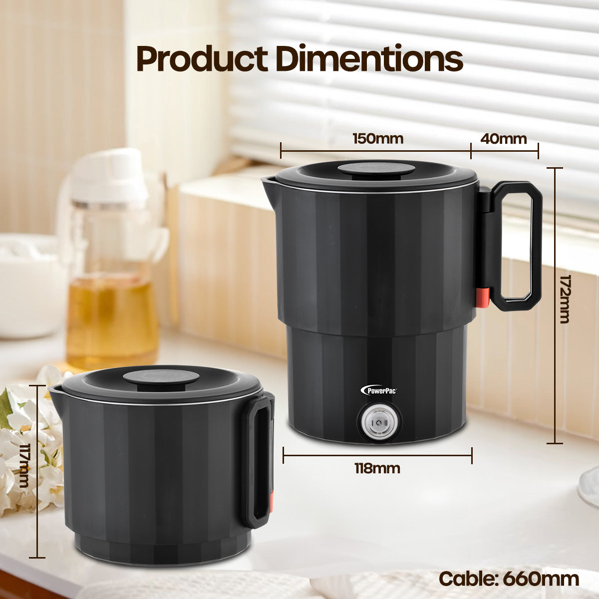 Introducing the PowerPac Foldable Electric Travel Kettle 1L PPJ2025, a useful appliance which you can take along whenever and wherever you travel. The steps required to fold and unfold the kettle are very simple, utilises a pull-tab design and takes less than 2 seconds to fold or unfold. When folded, it is very compact and lightweight; folding from 18 cm to 8 cm! Thus you could put it inside your luggage with nary a care whether your luggage has enough space or would be over-weight.