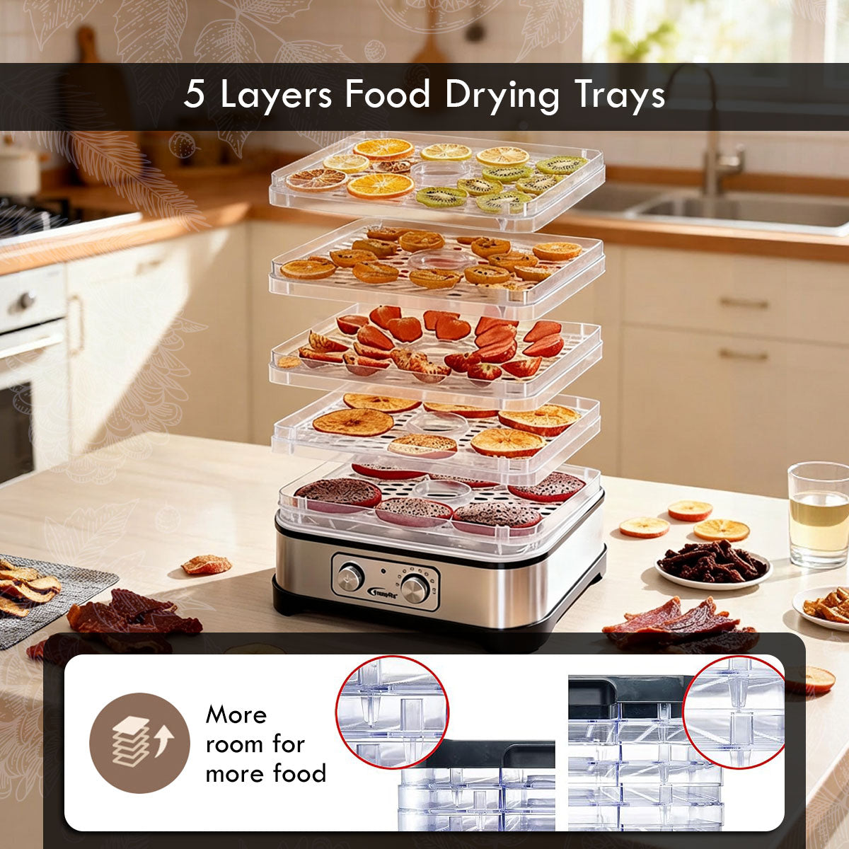 Designed with 5 spacious drying layers, it provides ample space to prepare multiple ingredients at once. The unit features 8 adjustable temperature settings from 35–70 °C, allowing precise control to suit different food types, from delicate herbs to thicker meat slices. A 360° circulating airflow system ensures even heat distribution across all trays for consistent, uniform drying results.