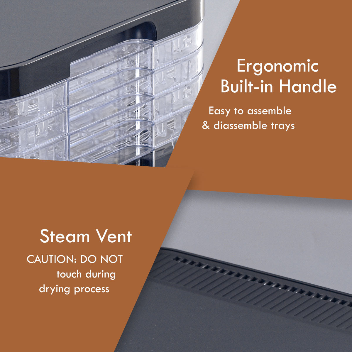 The removable transparent food-grade plastic shelves make it easy to monitor the drying process without interruption, while also offering flexibility to accommodate foods of varying sizes. An ergonomic handle design allows shelves to be easily assembled or removed, improving convenience during loading and cleaning.