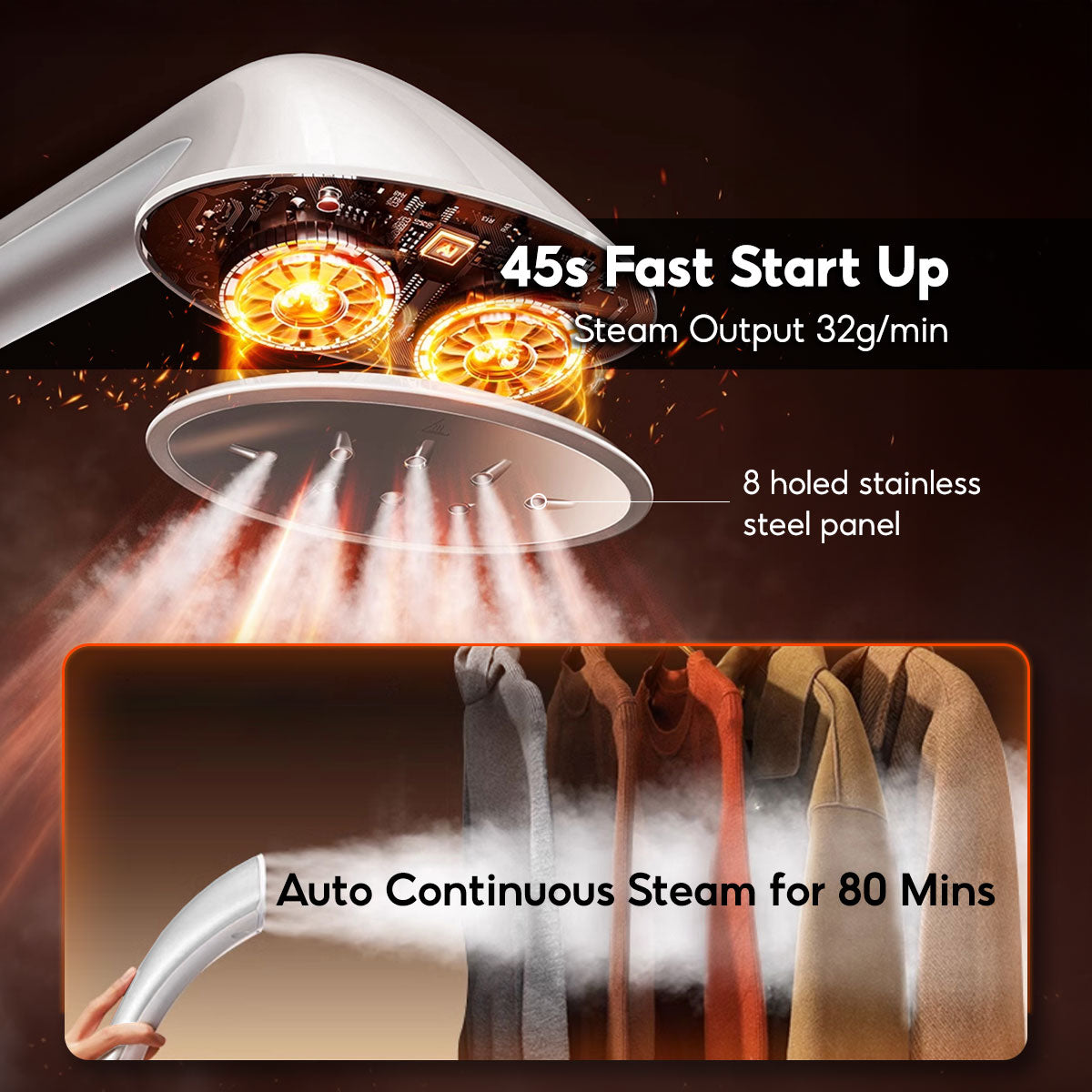 - 45 sec fast start up, auto continuous steam for 80 mins, at 32g/min for quick & easy de-wrinkling