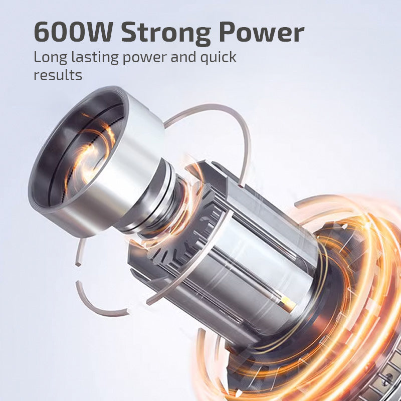The 3-speed 600W Motor is very powerful. Just press the Speed buttons to operate and release to stop.