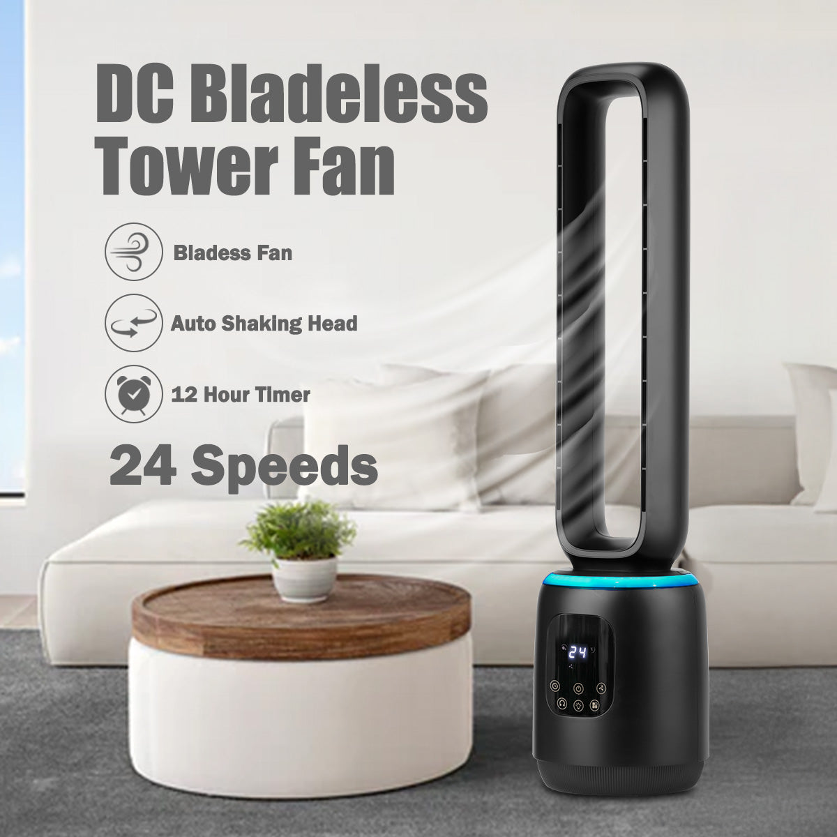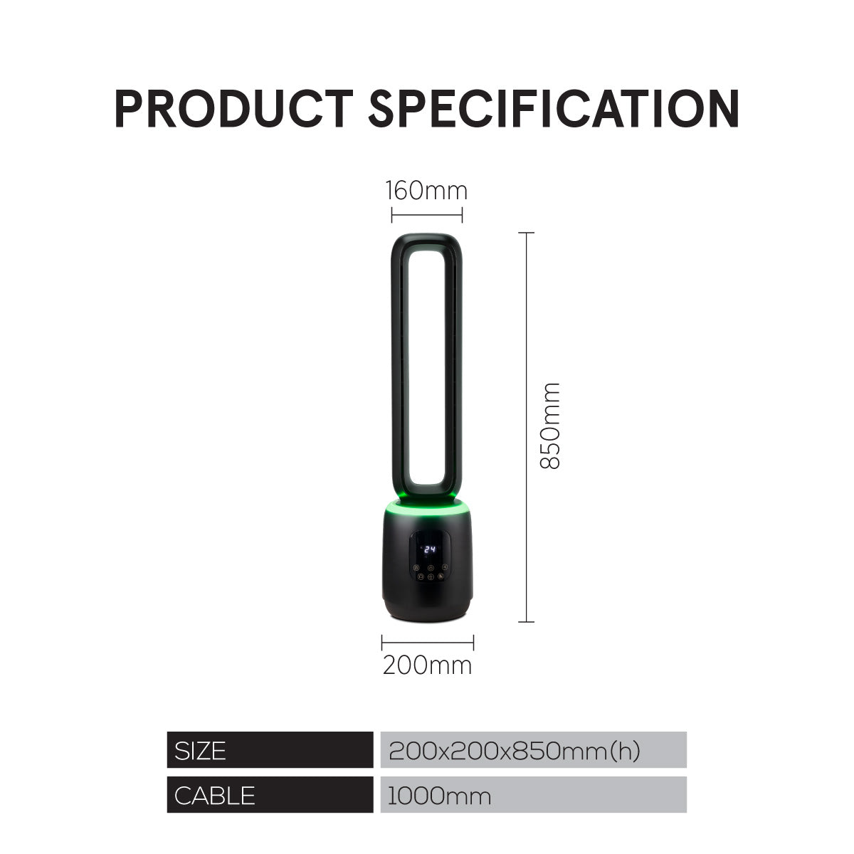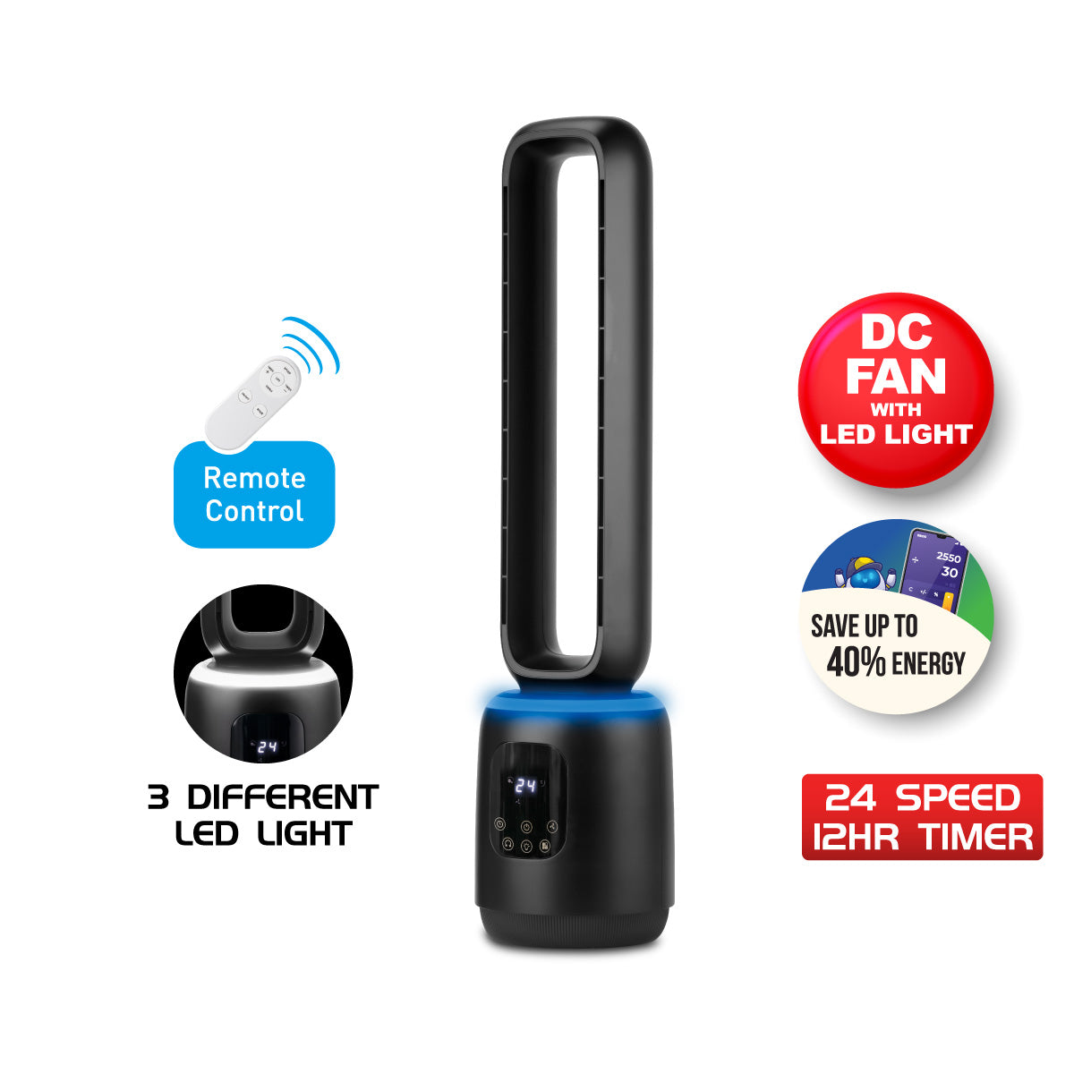 [NEA CLIMATE VOUCHER $400] iFan DC Bladeless Tower Fan – Remote Control, Oscillation, Timer, LED Lamp, Touch-screen, 3 Modes, 24-Speed, black, IF7463