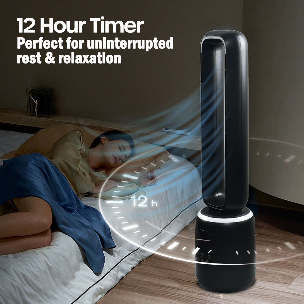 This fan also features a built-in LED lamp with four colour options, adding a soft ambient glow that enhances the mood of your space, day or night. With a 70° oscillation angle, strong airflow up to 5.06 m/s, and a 0–12 hour timer, it delivers wide and consistent cooling coverage while conserving energy.