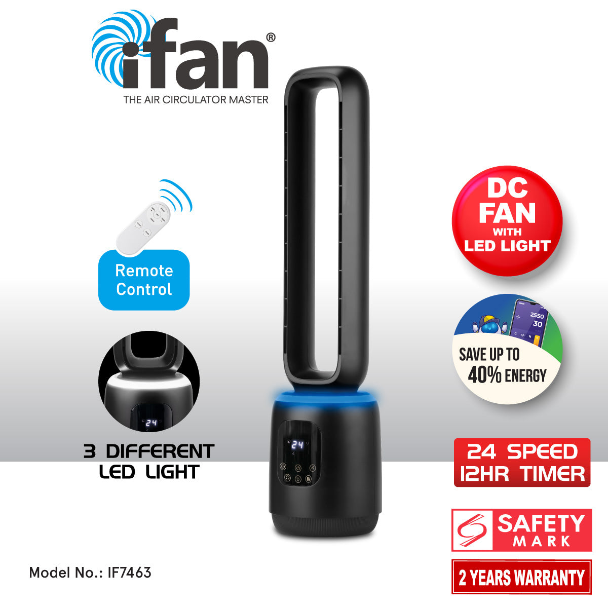 Lightweight yet powerful, the PowerPac iFAN IF7463 blends performance with elegance — offering whisper-quiet comfort, stylish illumination, and reliable cooling. Comes with a 24-month motor warranty (with proof of purchase) for lasting peace of mind.