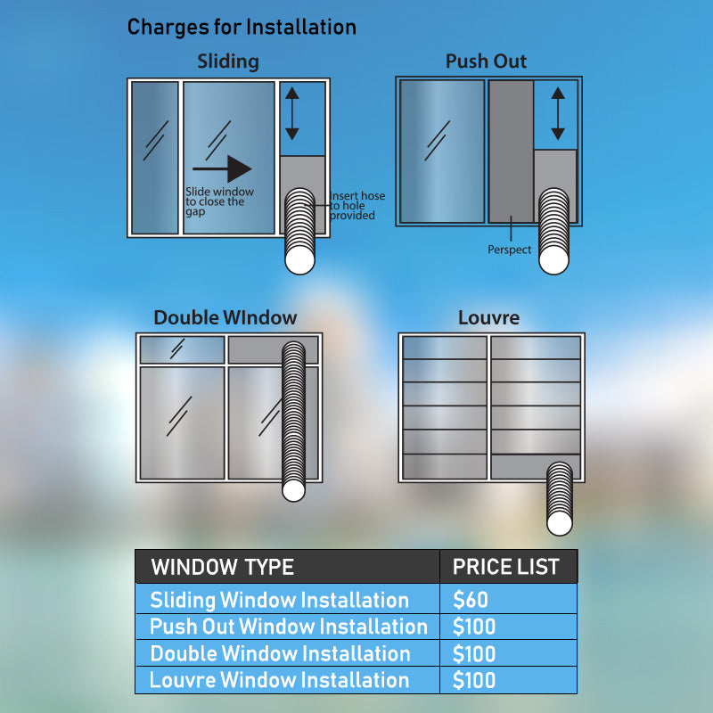 You are probably worried about the hassle of installation. We have got that covered. As long as a lift services your floor, delivery is free, and installation charges are very reasonable from $60 for Sliding windows to $100 for Push-out/Double/Louvre windows. We'll make sure that your family will enjoy the comforts of cool air without you having to run around sweating with different contractors.