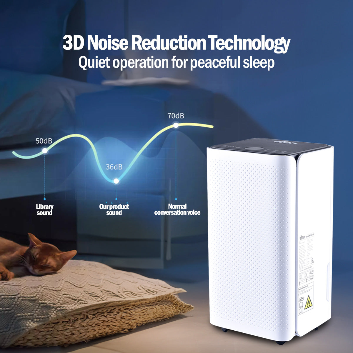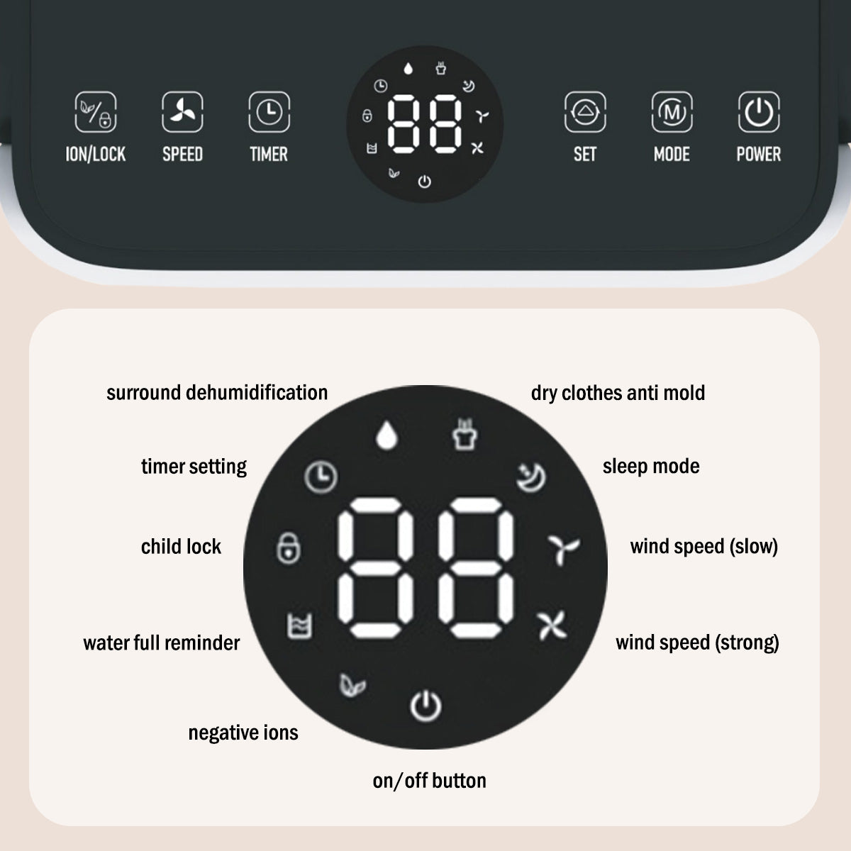 Highly efficient dehumidification which is Ultra-quiet and with 11 Humidity level settings: 30% - 80%, extracts up to 12 Litres of moisture daily in a humid environment of 30oC and 80% relative humidity. 2 speeds and 3 modes (Auto, Continuous, Sleep), 3-Colour Digital Display indicating increasing humidity levels (below 45%, 45 – 65%, above 65%).