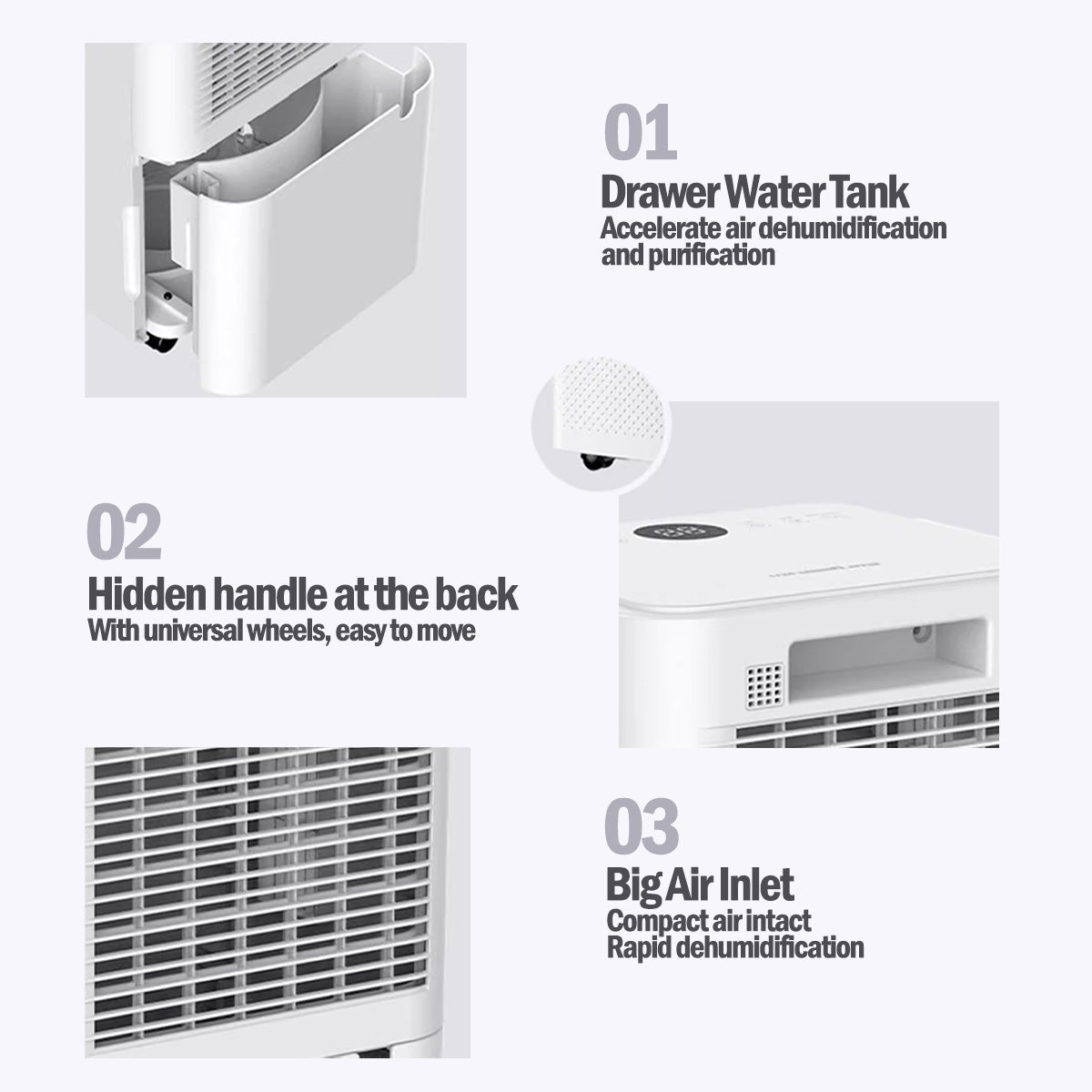 Safety functions include Automatic Defrost, 3-minute delay after the Compressor is turned off, Automatic Shut-off when water exceeds maximum in Water Pan. Works with both Manual Drainage and Continuous Drainage.
