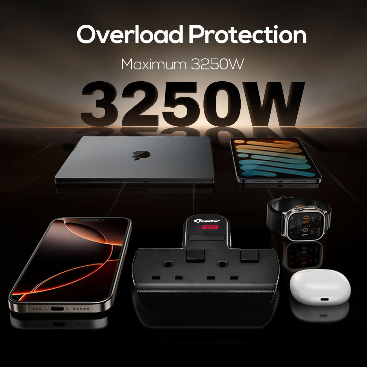 The PowerPac 2 Way Adapter for 3-Pin Plug PP272, in Black, comes with 2 3-PIN electrical sockets.