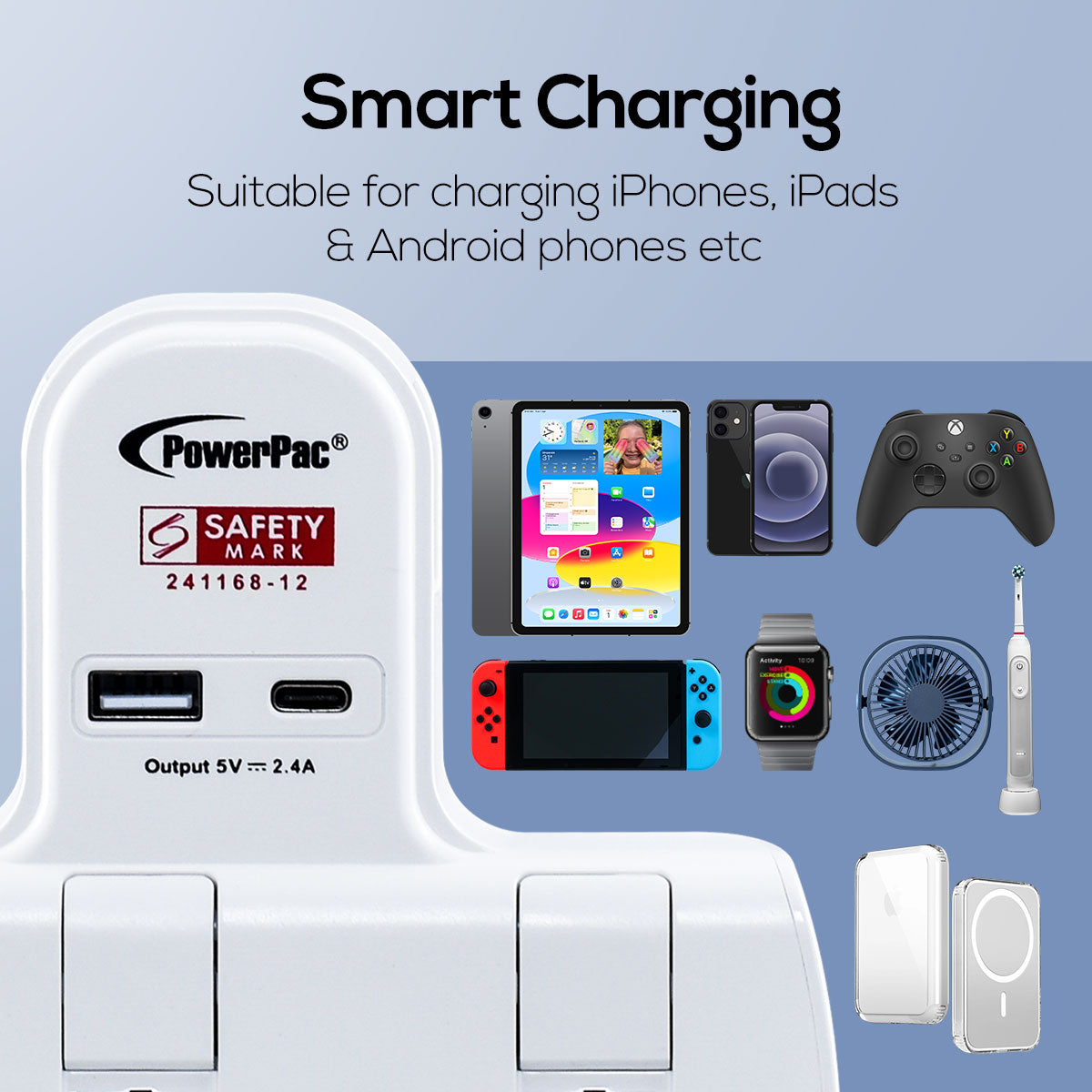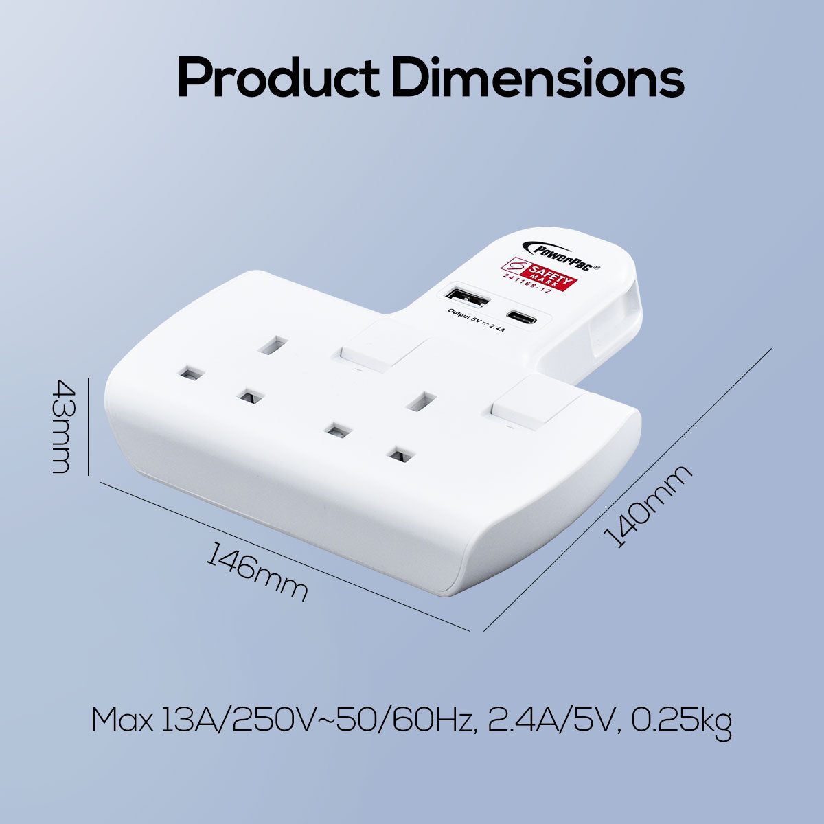 The PowerPac 2 Way Adapter for 3-Pin Plug with USB Charger, 1 USB-A, 1 USB-C PP292U is lightweight & compact and comes with Singapore's Safety Mark (241168-12) attesting to its safety.