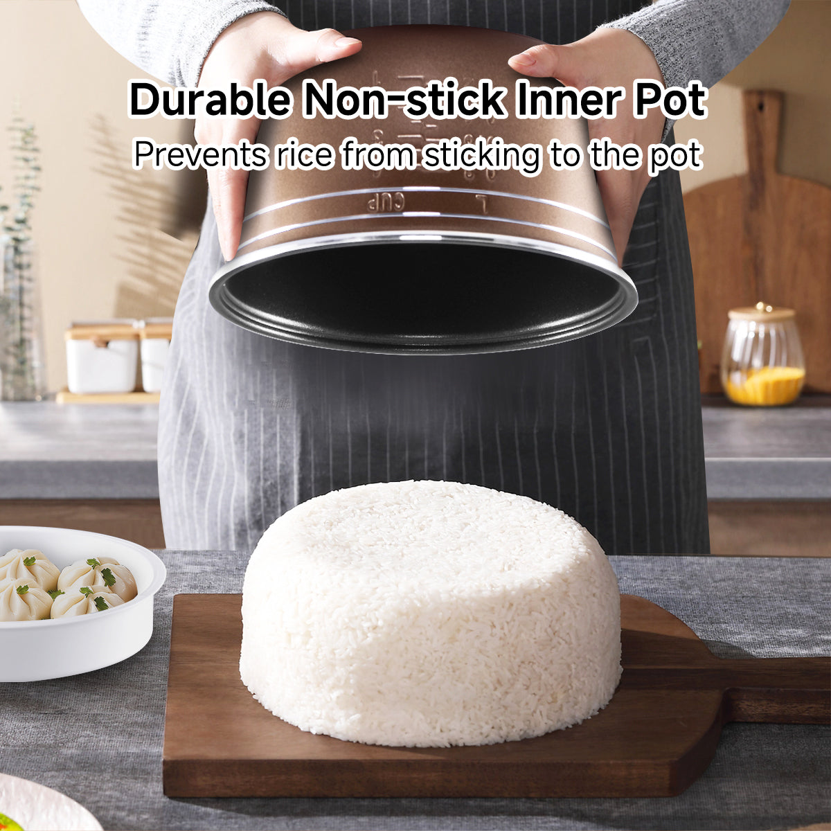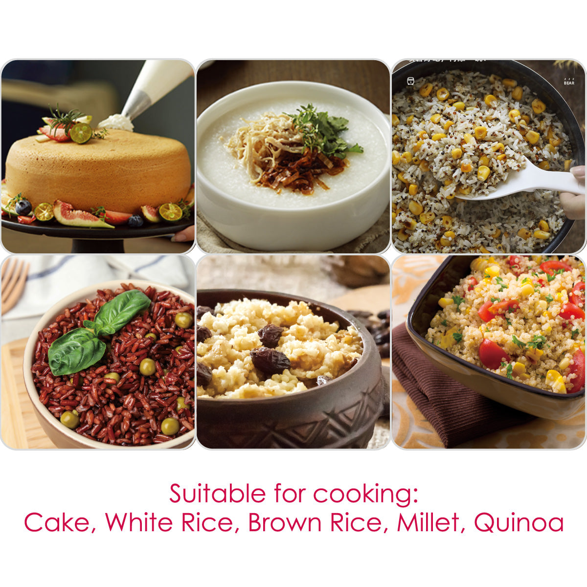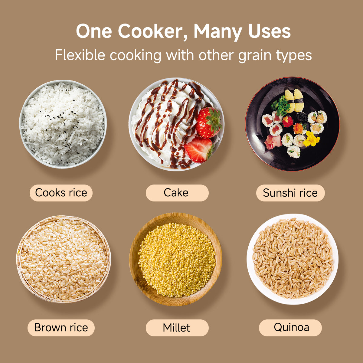 - Cooks rice, cake, sushi rice, brown rice, millet, quinoa, etc