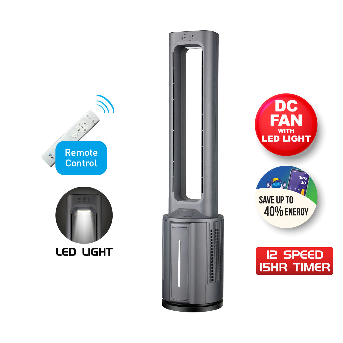 - iFan DC Bladeless Tower Fan – Remote Control, Oscillation, Timer, LED Lamp, Touch-screen, 3 Modes, 12-Speed (IF7477)
