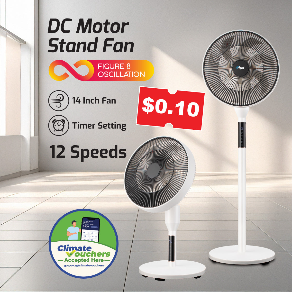 [NEA CLIMATE VOUCHER $400]iFan 14” DC Motor Stand Fan With Figure 8 Oscillation, white, IF7436