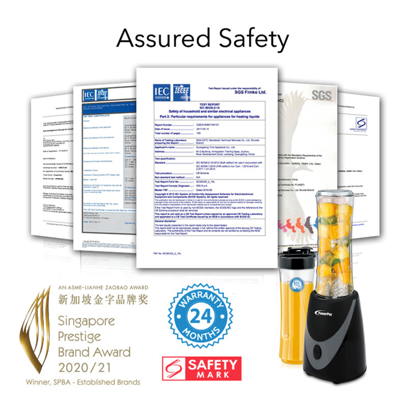 The blades of the PowerPac Personal Juice Blender with 2x BPA Free Jugs PPBL500 spins effortlessly. After blending, just unscrew the Blender Blade assembly on top of the Blender Bottle, screw the Lid on and take it along with you wherever you go. You can chuck the Motor unit in a little corner, or even bring it with you! Still, it remains an energy efficient, safe and easy-to-use kitchen appliance which will make blending convenient for you and whoever you want to share this with.