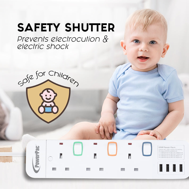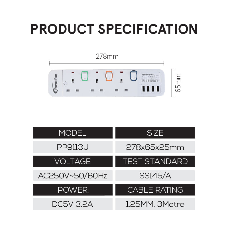 The Safety Extension Sockets in this range, all in white, comprises power cable lengths of 3 m, and is equipped with 3, 4, 5 or 6 electrical sockets plus 4 built-in USB Sockets with 3.2A on the powerboard. This model, PP9113U, comes with 3 electrical sockets. With 2-Pin direct, inserting 2-Pin plugs into the sockets no longer require any plastic adapters.