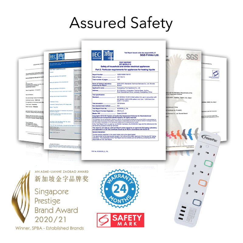 It has 3 important safety features: Built-in Surge Protector safeguards electronic devices such as your TV system or computer from high-voltage power surges; while Safety Shutter prevents children from tampering with the device. All materials are Fire-retardant.